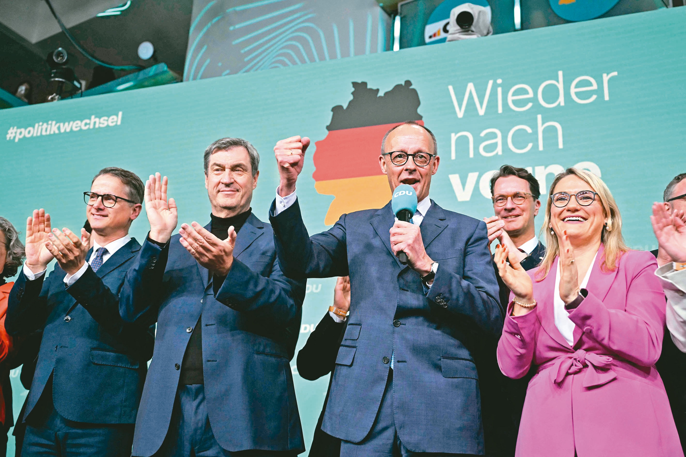 德國基民黨黨魁、總理候選人梅爾茨(右二)廿三日在柏林向支持者發表演說。