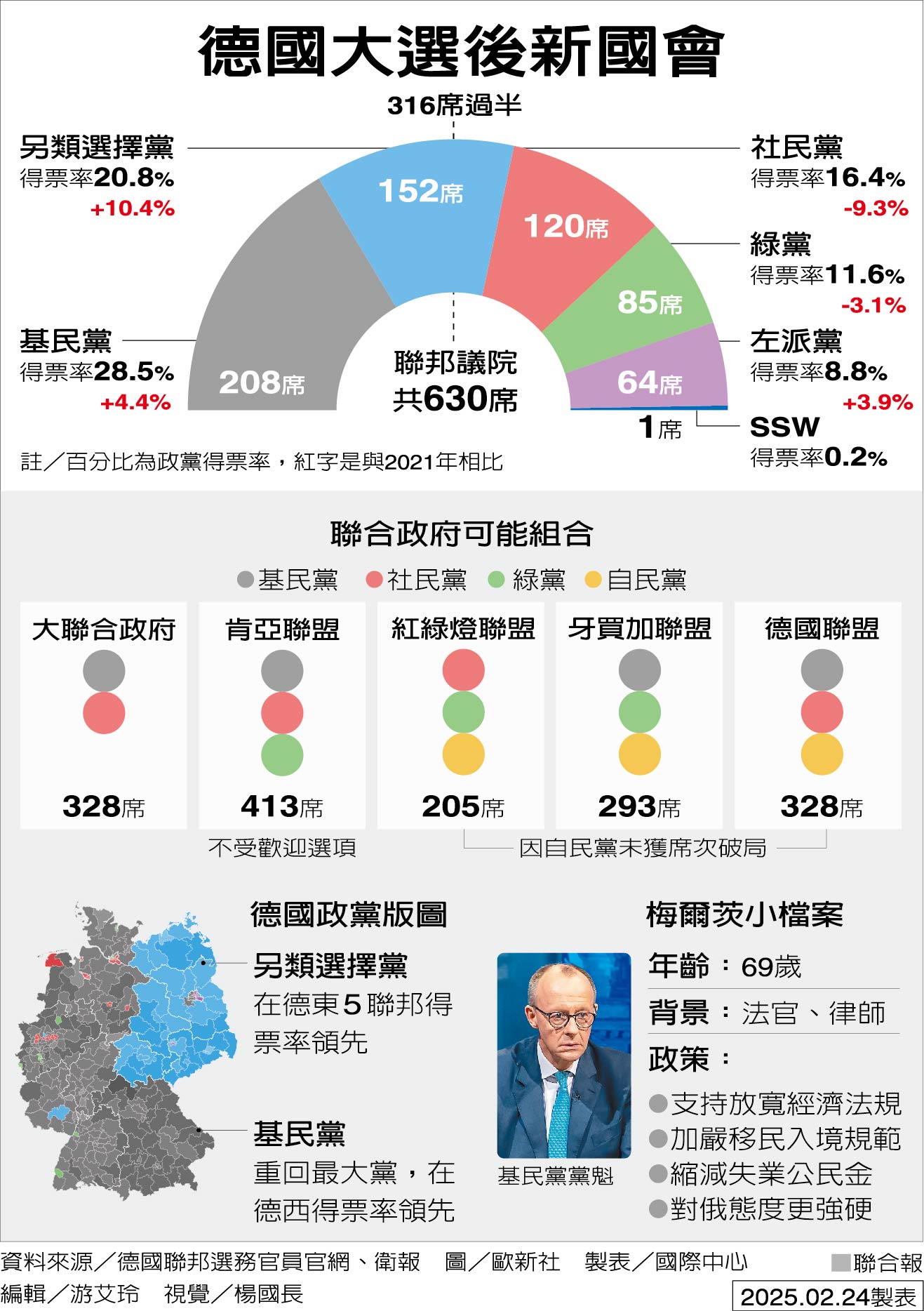 派的總理候選人梅爾茨有機會坐上總理寶座。由於基民黨未單獨過半,梅爾茨會自廿四日