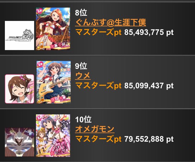 ゲッサンP終於下定決心要衝十位內了(十位內會在活動結束動畫中出現ID)
