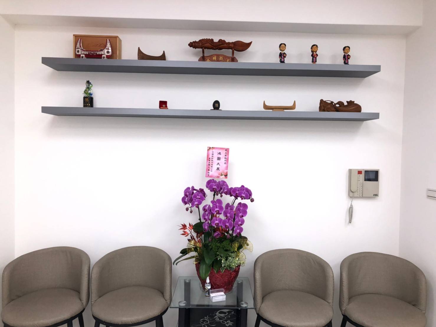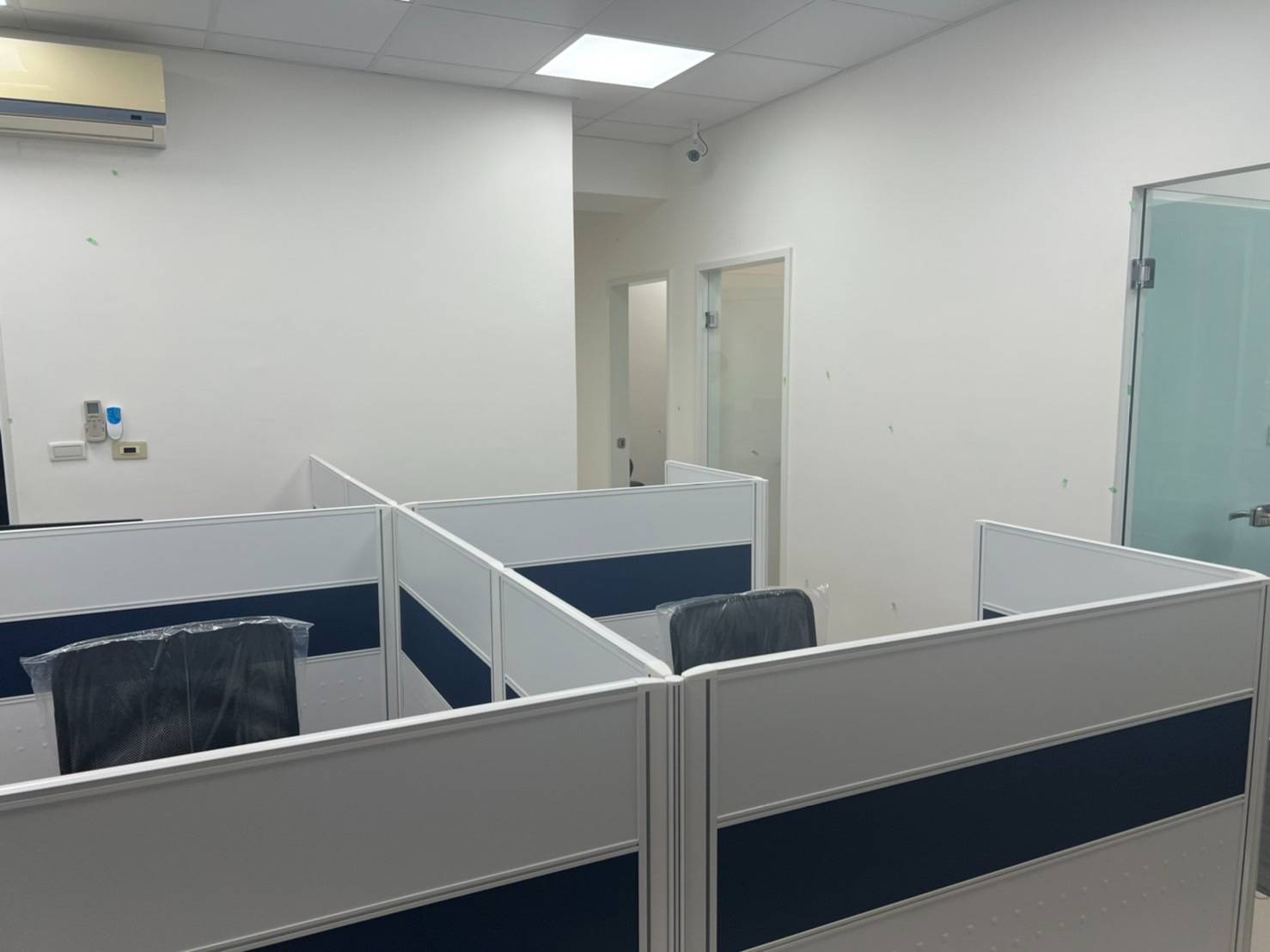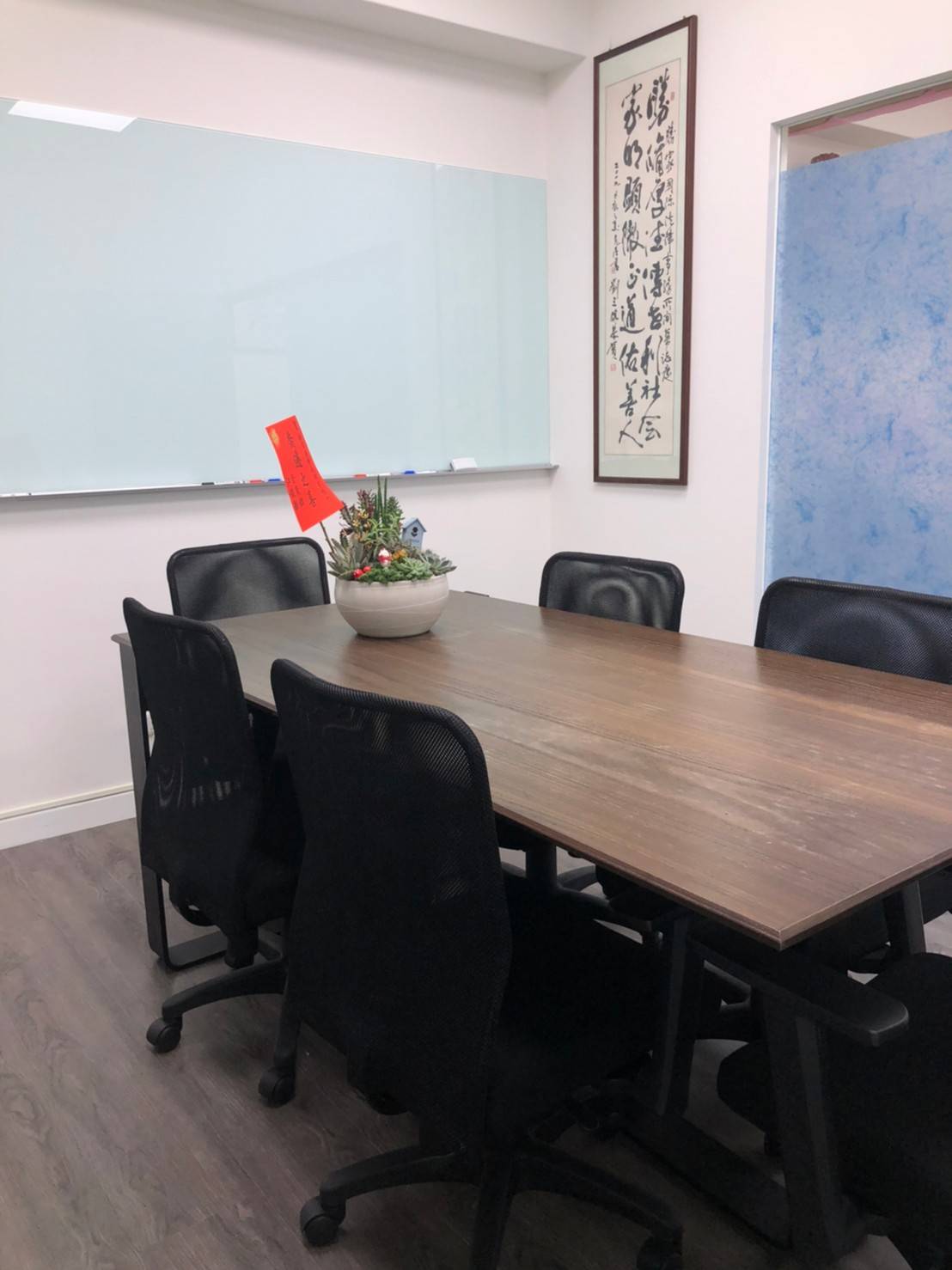 、網路、多功能事務機(列印、掃描、傳真、影印)、碎紙機等。會議室,大面白板玻璃