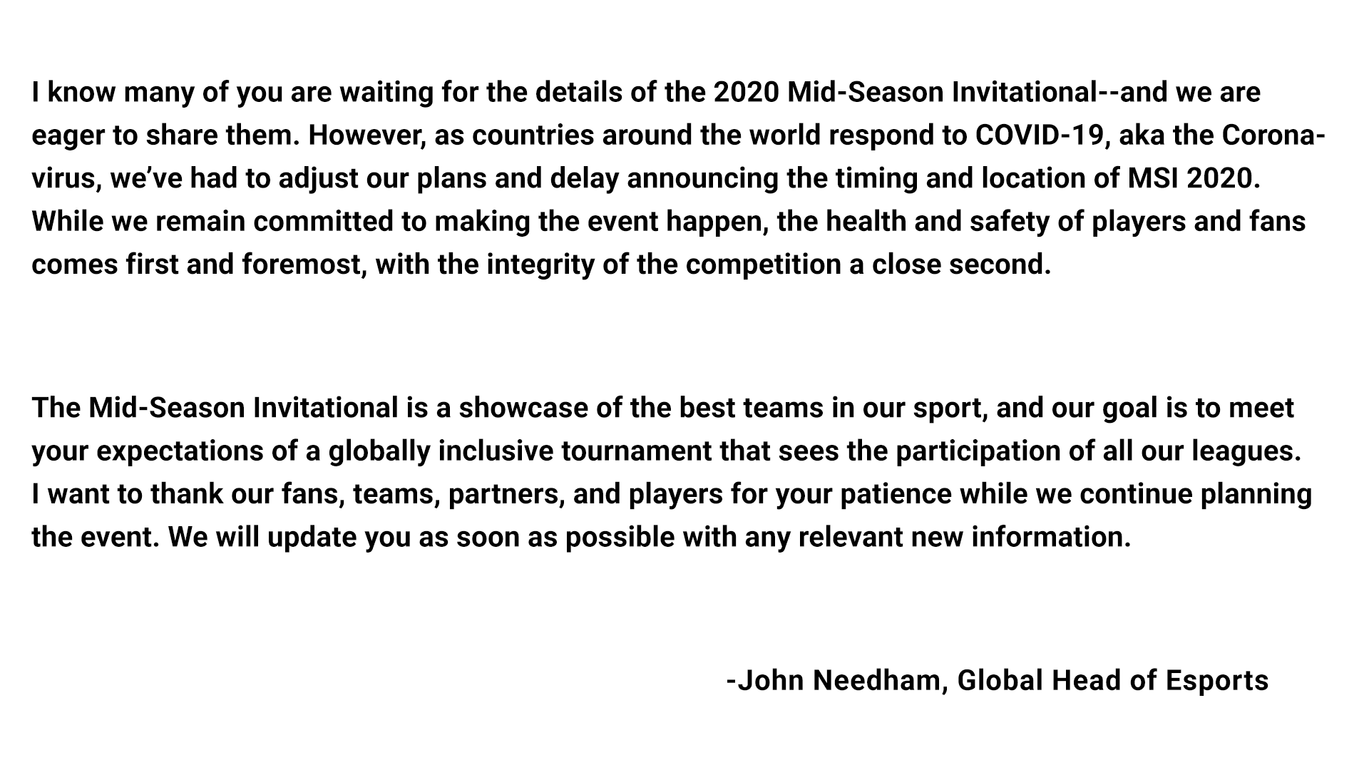 John Needham 今日透過《英雄聯盟》電競賽事官方 Twitter 發表聲明