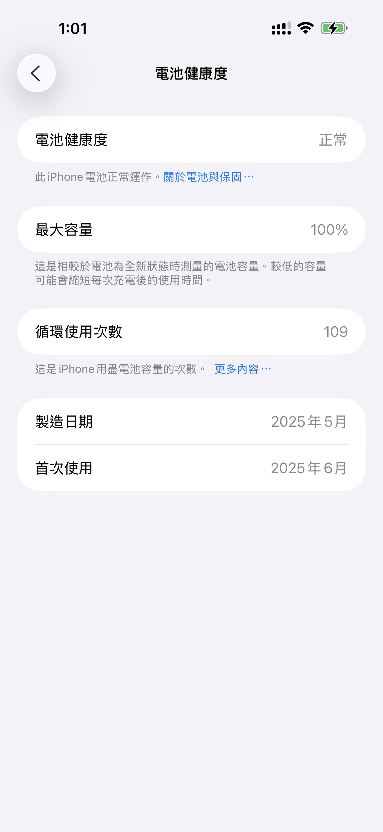 電池健康度 100%,循環次數 109