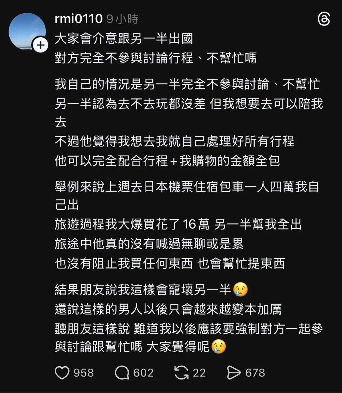 對方完全不參與討論行程、不幫忙嗎