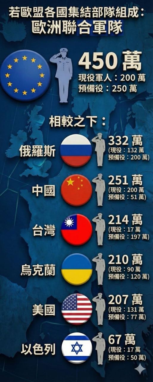 : 歐盟的現有實力最強,一旦將現在成員國組成歐洲軍團,現役人數就高達200萬人。