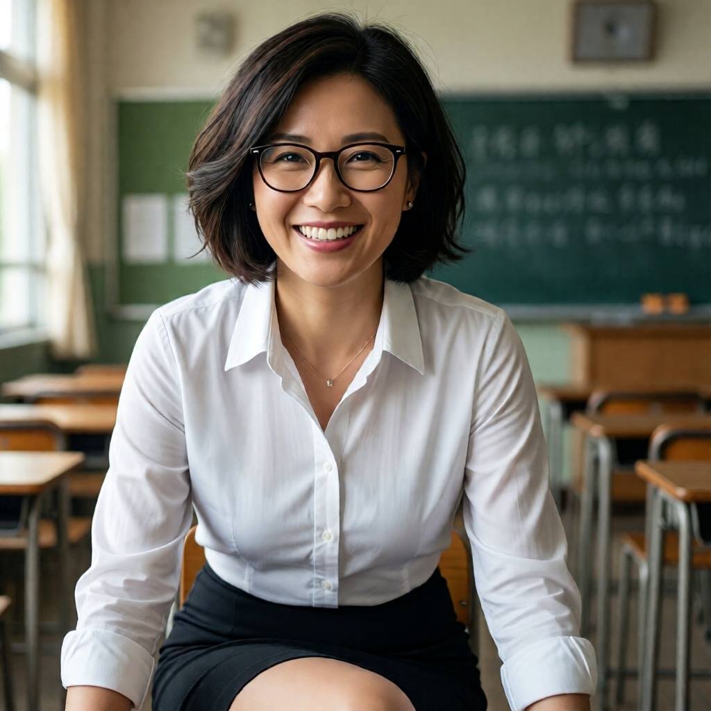 : : 同樣的咒語:"短髮眼鏡女老師,白色襯衫黑色短裙,臉上帶著笑容",