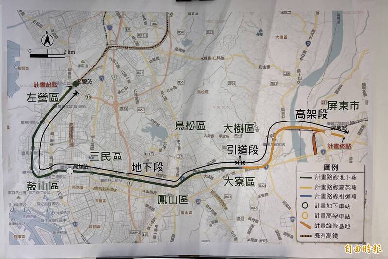 表示,全案以高鐵左營站月台南端尾軌為起點,終點至屏東台糖六塊厝農場,路線約略平