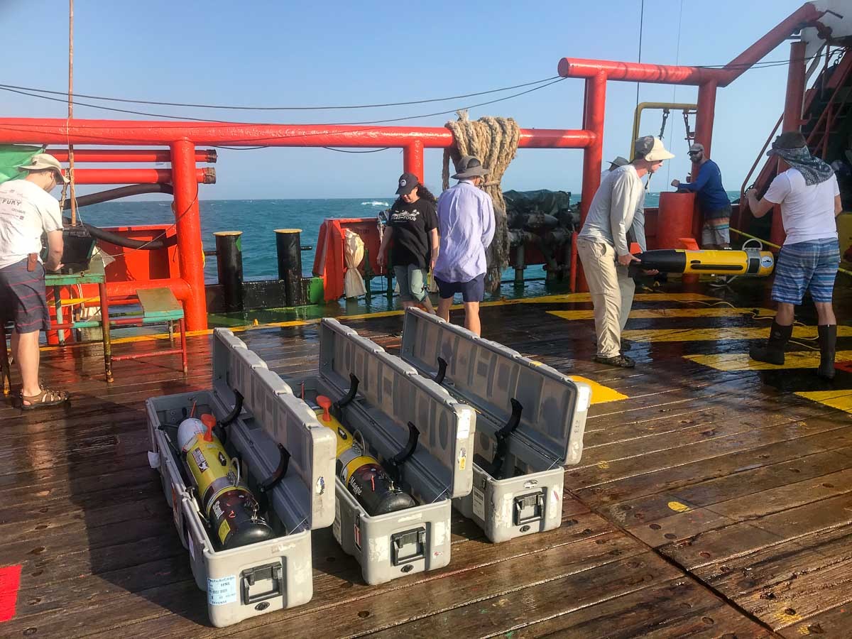 圖中地上擺放的就是水下遙控自動裝置,它的兩端可各自掃描約70公尺長區域,有助於找