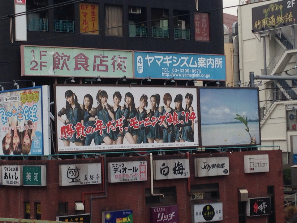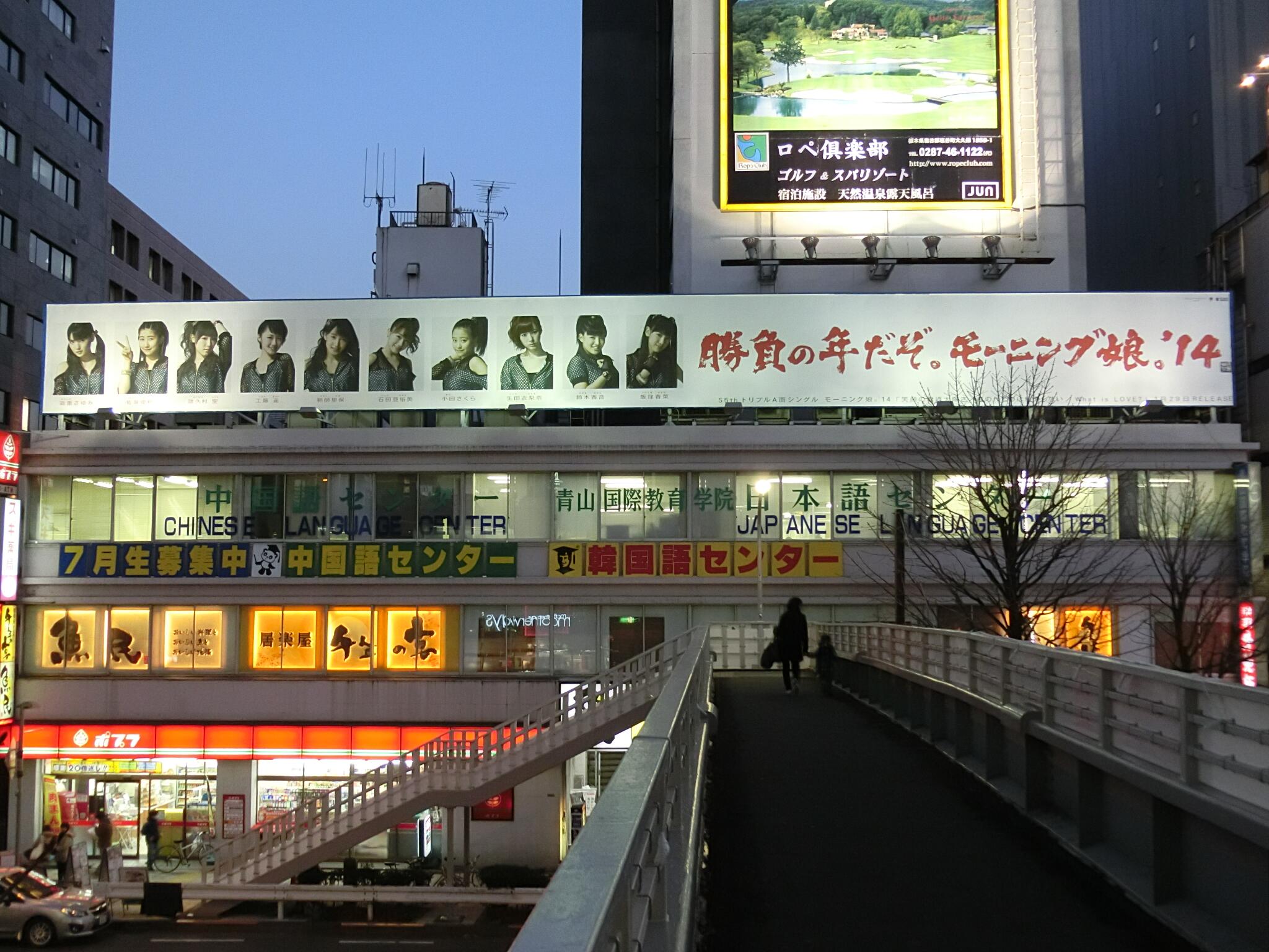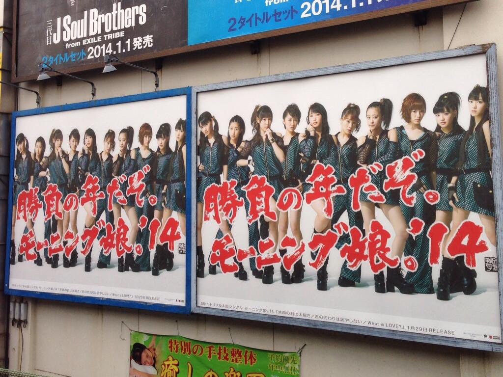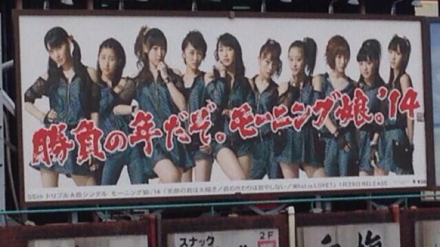 上頭寫著「勝負の年だぞ。モーニング娘。'14」(決勝負的一年。早安少女組'14) 大部分目前被看到的看板都是上面那樣 另外也有人發現這種長條形的