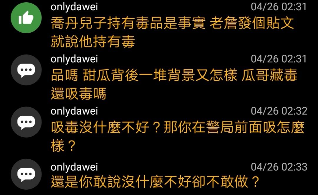 → onlydawei : 我的邏輯是你覺得吸毒沒有不好,要不要去警察局前面 04/26 03:50