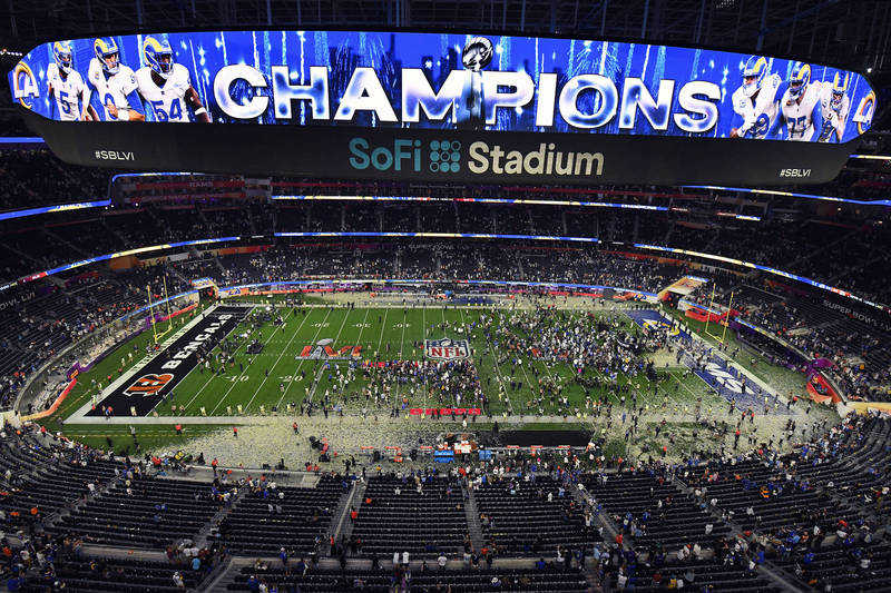 洛杉磯公羊拿下隊史第二冠,SoFi體育場(SoFi Stadium)電子看板秀出「冠軍」大字慶