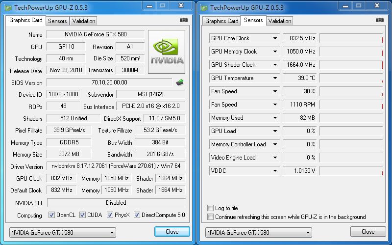 GPU-Z, 可以注意一下目前待機溫度為39度.