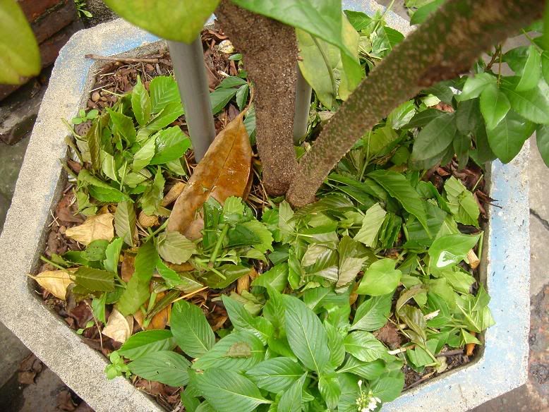 1.火筒樹栽種於六角大花盆 土面的枯枝落葉碎屑