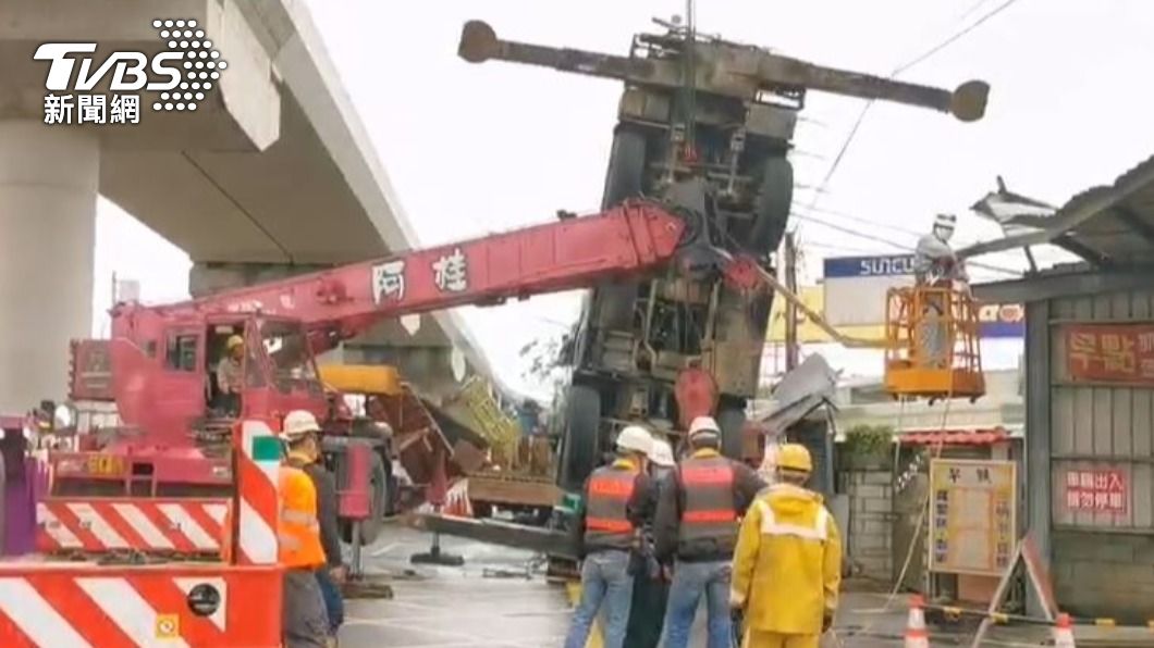 疑似吊臂伸太長重心不穩翻覆。(圖/TVBS) 今(9)日下午1點多,桃園捷運綠線於蘆