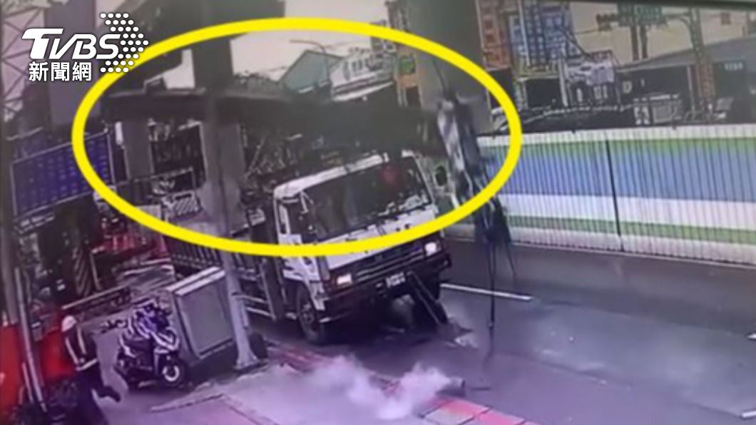 不只砸毀一旁卡車,就連店家遮雨棚和號誌燈桿,也全被波及。好在當時因施工封閉該路段
