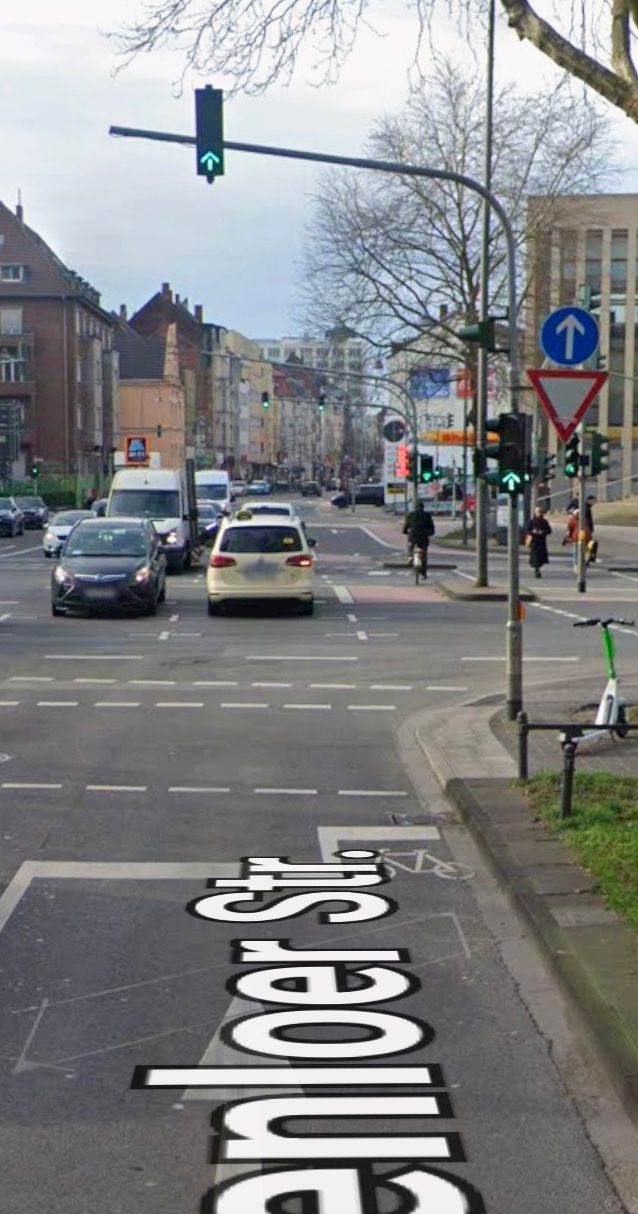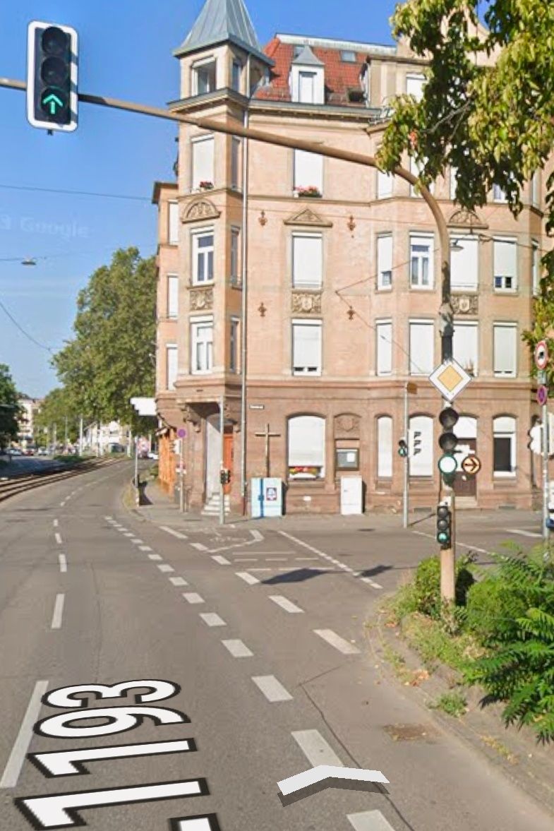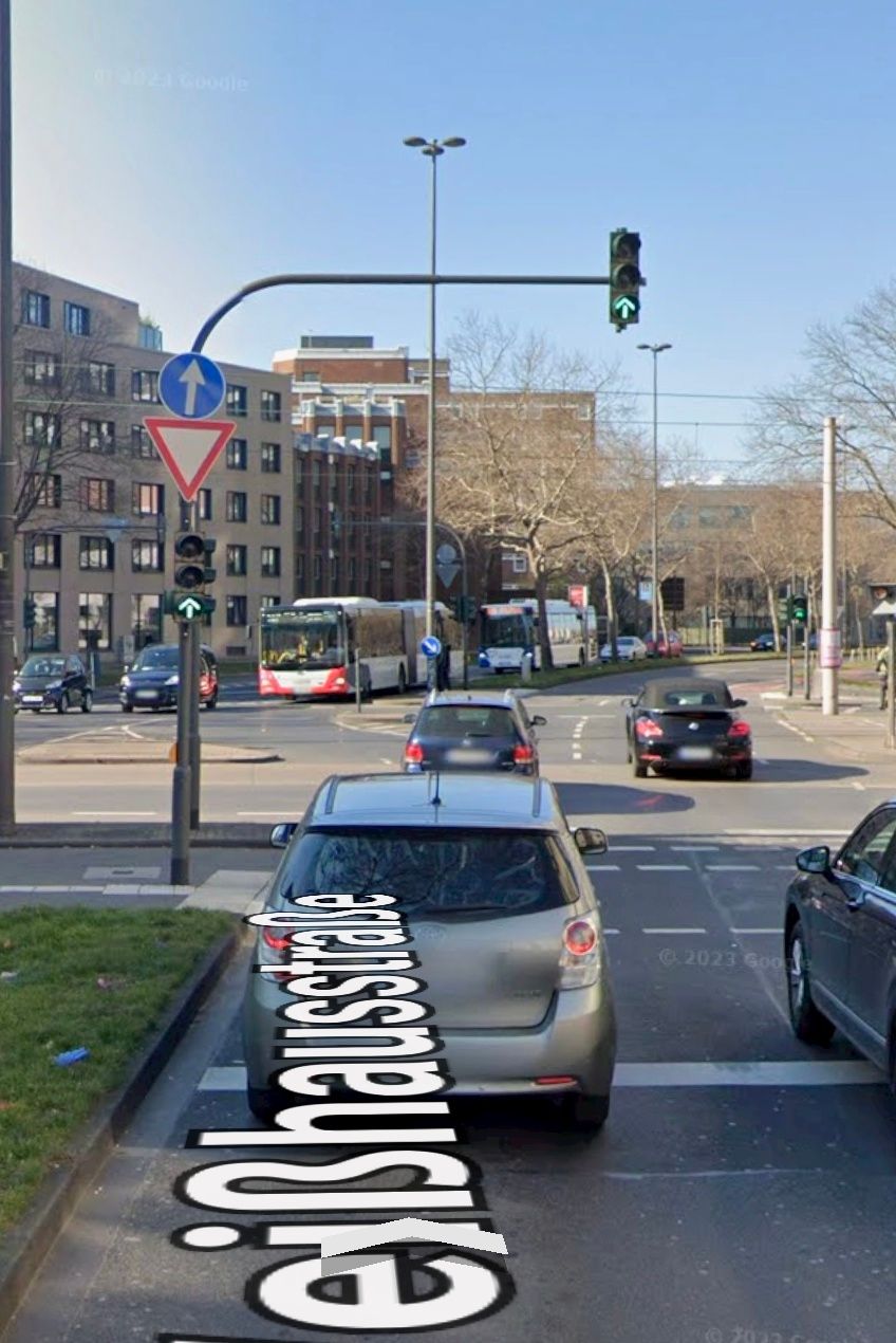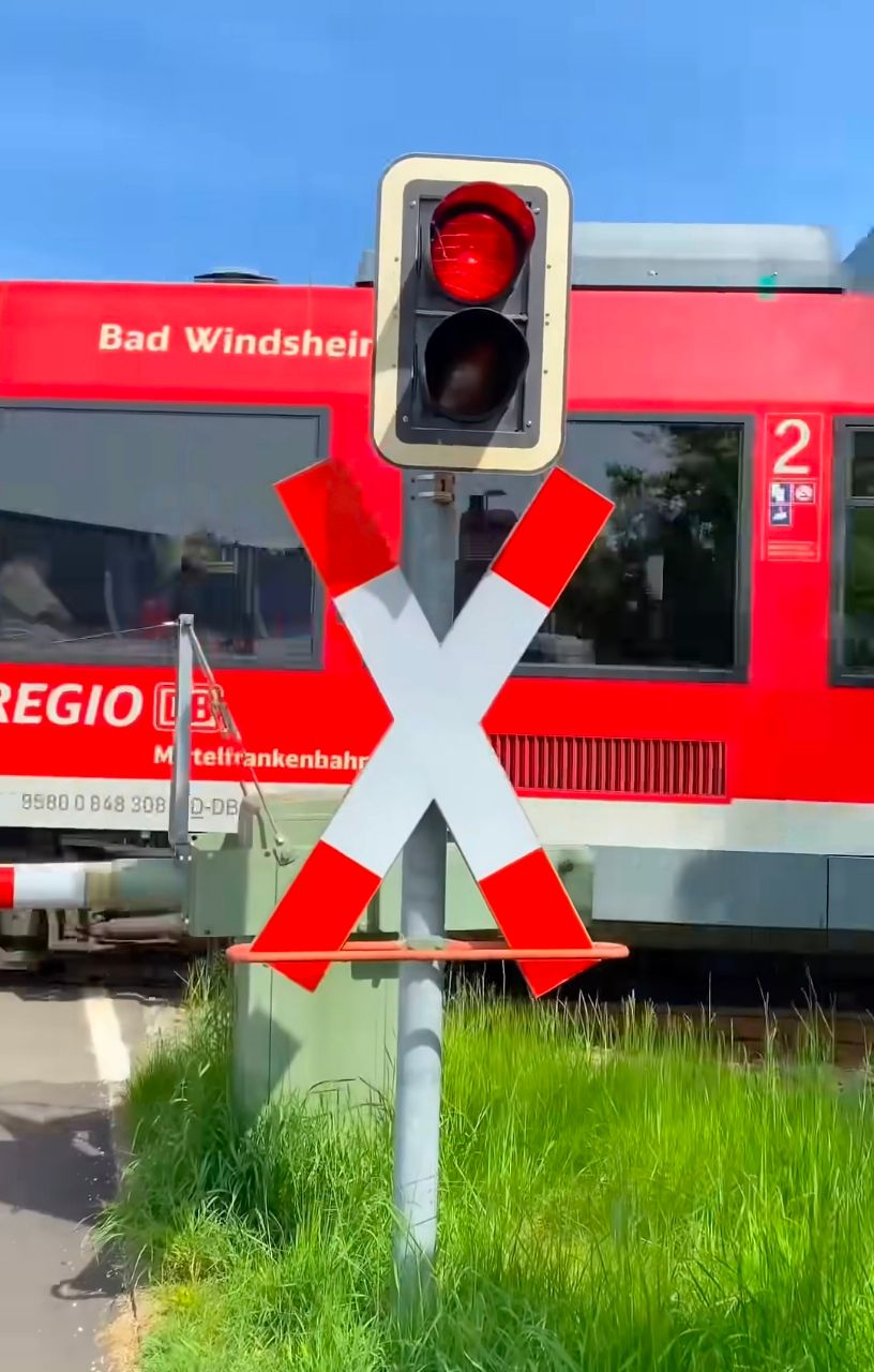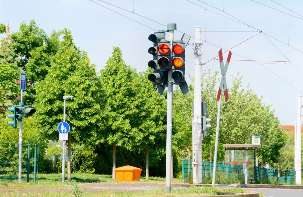 德國也會善用雙排的號誌去調控特殊路口的車流,如這個緊鄰平交道的十字路口: