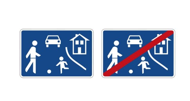 車輛路權與行人平等,必須以行人的速度行駛。劃掉代表結束交通寧靜區