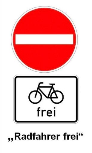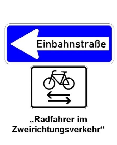 B. 藍底白箭頭Einbahnstrasse:單行道。而有些單行道不限制自行車只能單向行駛