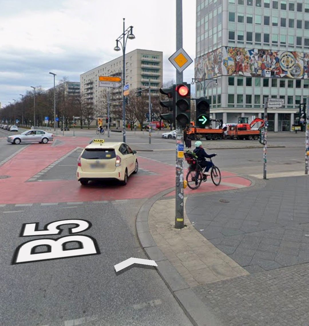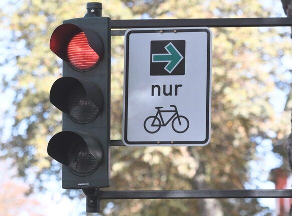 慕尼黑的綠箭頭不限於機動車輛,近年來他們也掛上了自行車右轉綠箭頭的金屬標誌。“