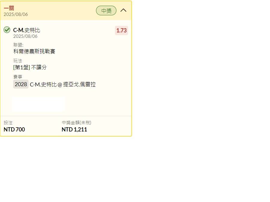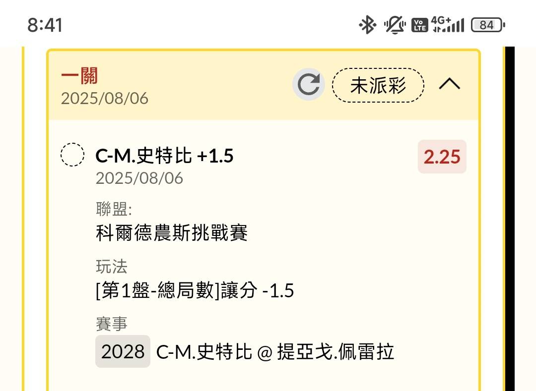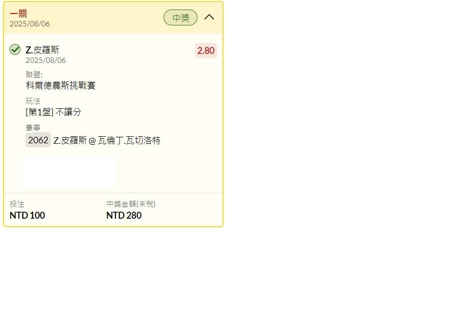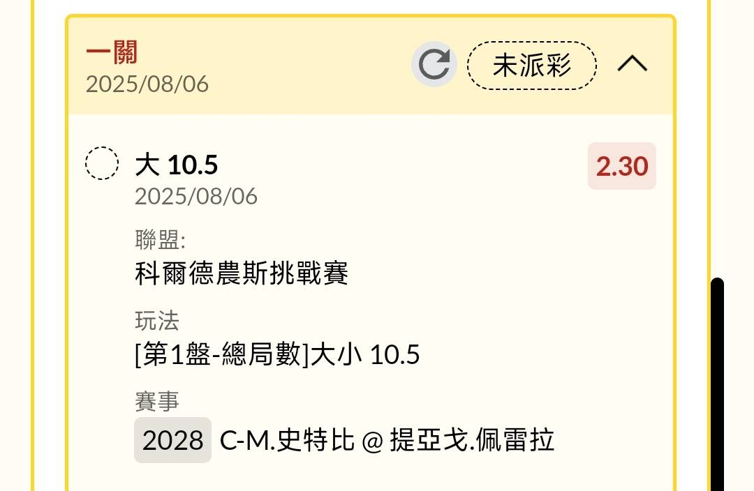 → nsrjchi: 賽前買第一盤皮羅斯7:6...9.25倍 1.174.132.50 08/06 23:49