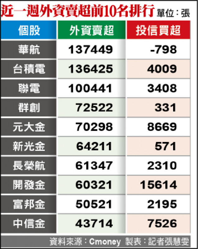 根據Cmoney統計近一週外資賣超顯示,華航名列第一、賣超張數高達十三萬張,台積電、