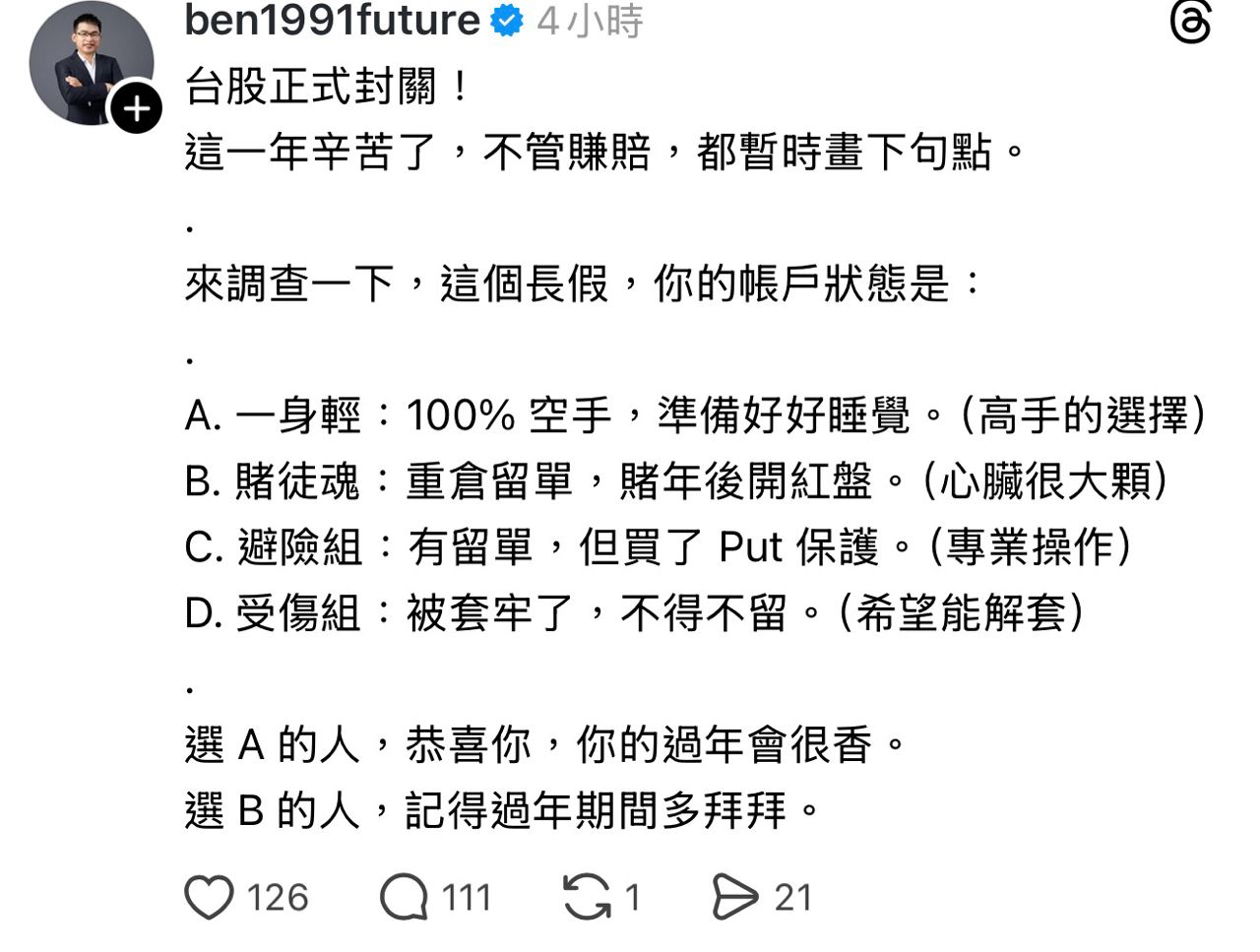 推 id44kimo : 照往例,台股過年都是躲噴 02/11 20:09