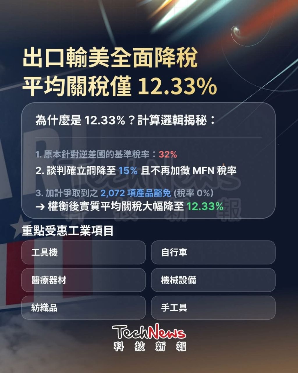 12.32%,這些是台灣非常強的項目,在美國市場應會有非常好的表現;其二則是適用對等