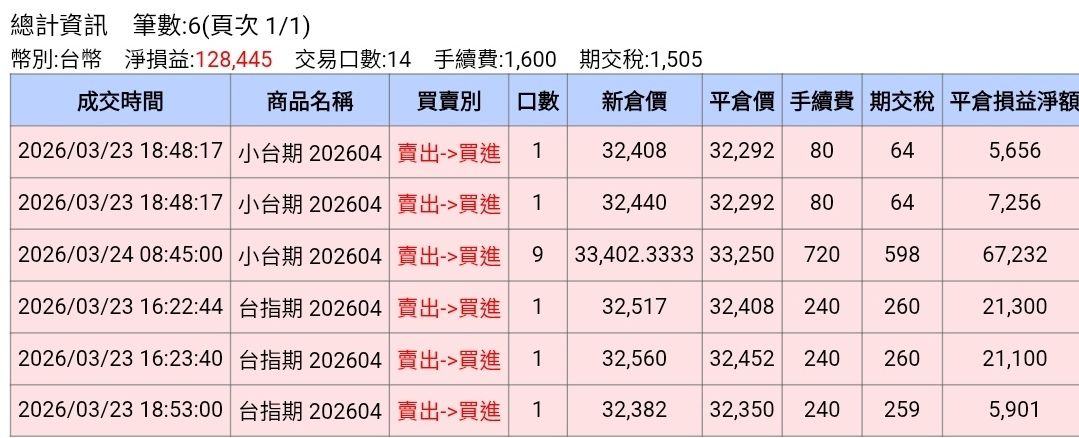 → Stuward : 昨晚發的7口小台只小賺出吧 其它都是昨天下午的帳 03/24 09:13