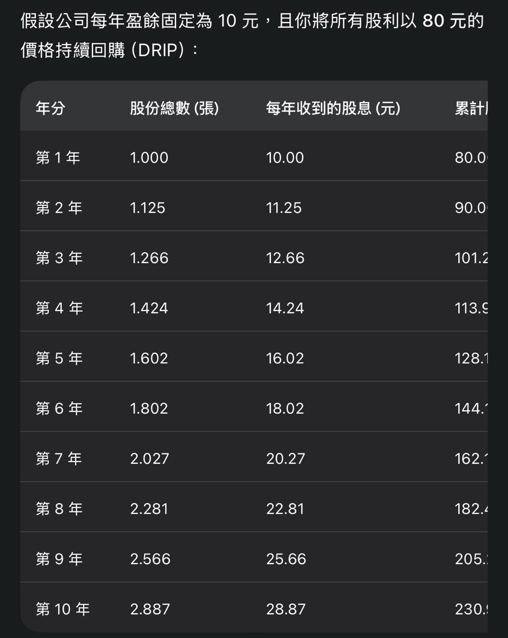 為了方便理解,先不算盈餘成長,並假設公司將賺的錢全發給股東。