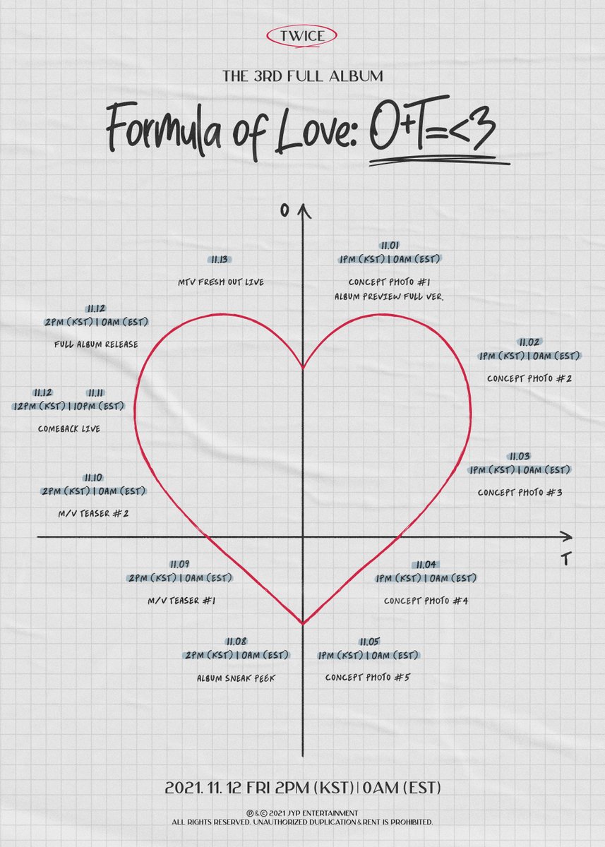 TWICE 3rd Full Album "Formula of Love: O+T=<3" Timetable Release on 2021.11.12 FRI 2PM (KST), 0AM (EST) "Formula of Love: O+T=<3" Pre-save & Pre-order