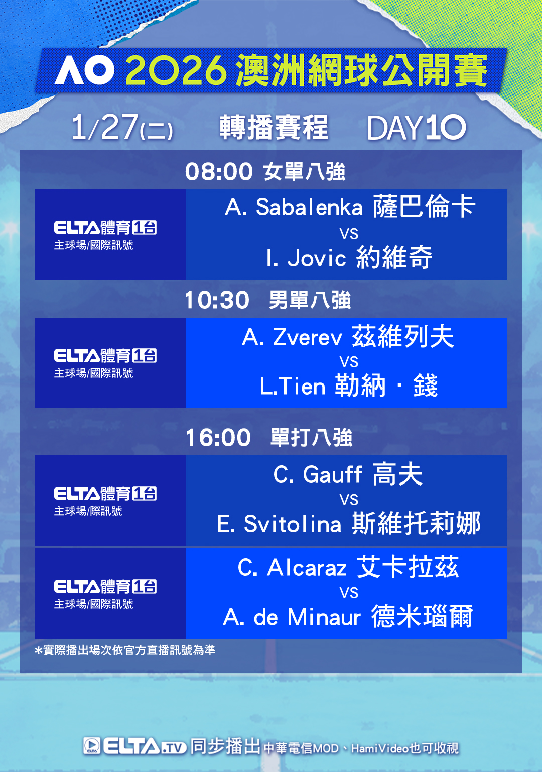 標題[情報] 澳網 1/27賽程 男女單八強(上)