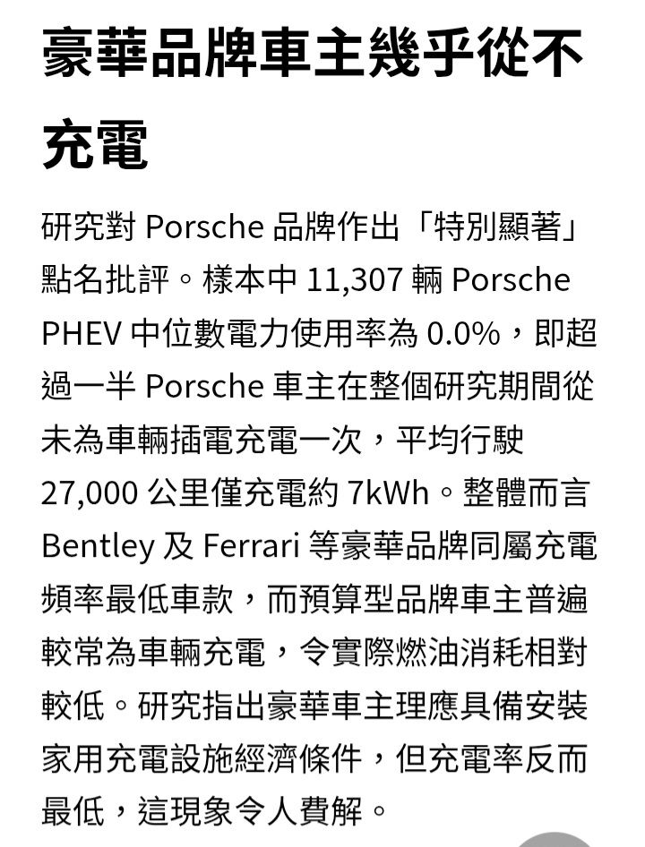 → OldWang911: 但是分析發現豪華品牌的PHEV車主充電頻率最低,果然03/04 10:39