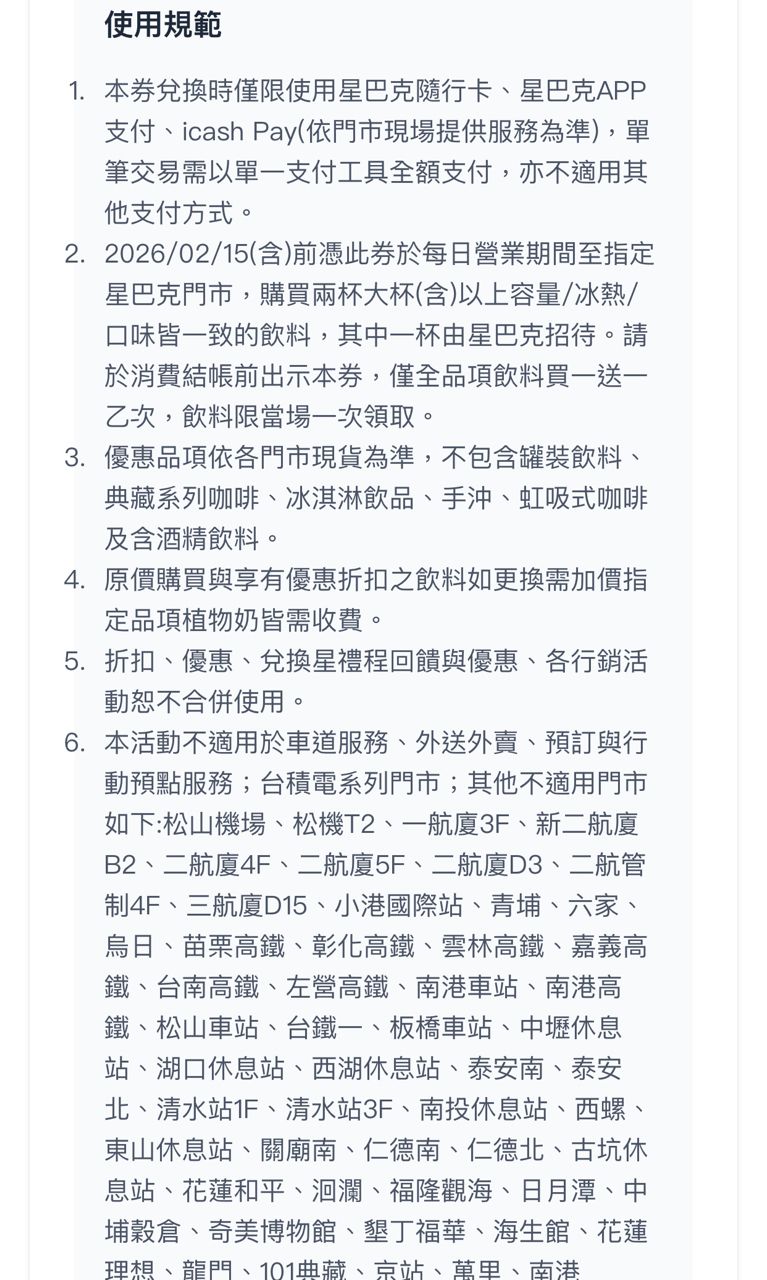 1. 星巴克買一送一券(期限2026/2/15)