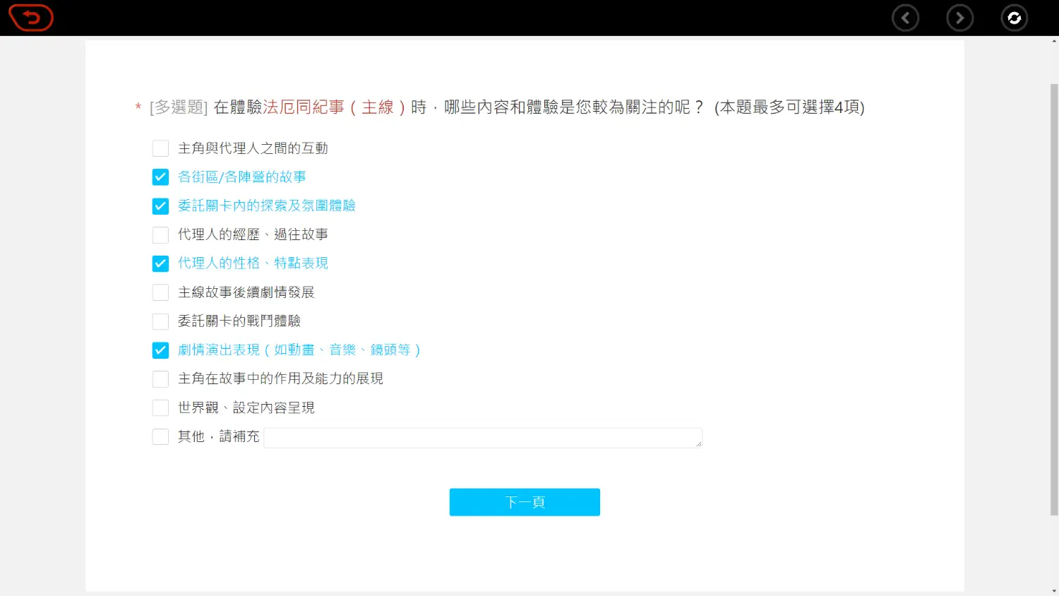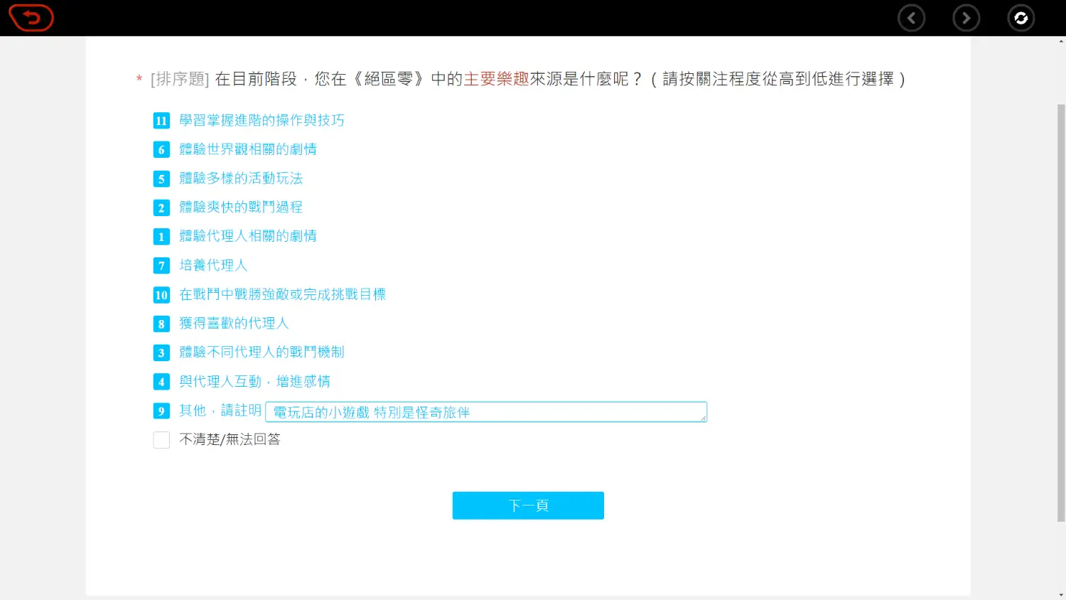 推 coldcolour: 填完了 主要問遊戲感受、大方向跟遊戲偏好那些 01/09 17:51