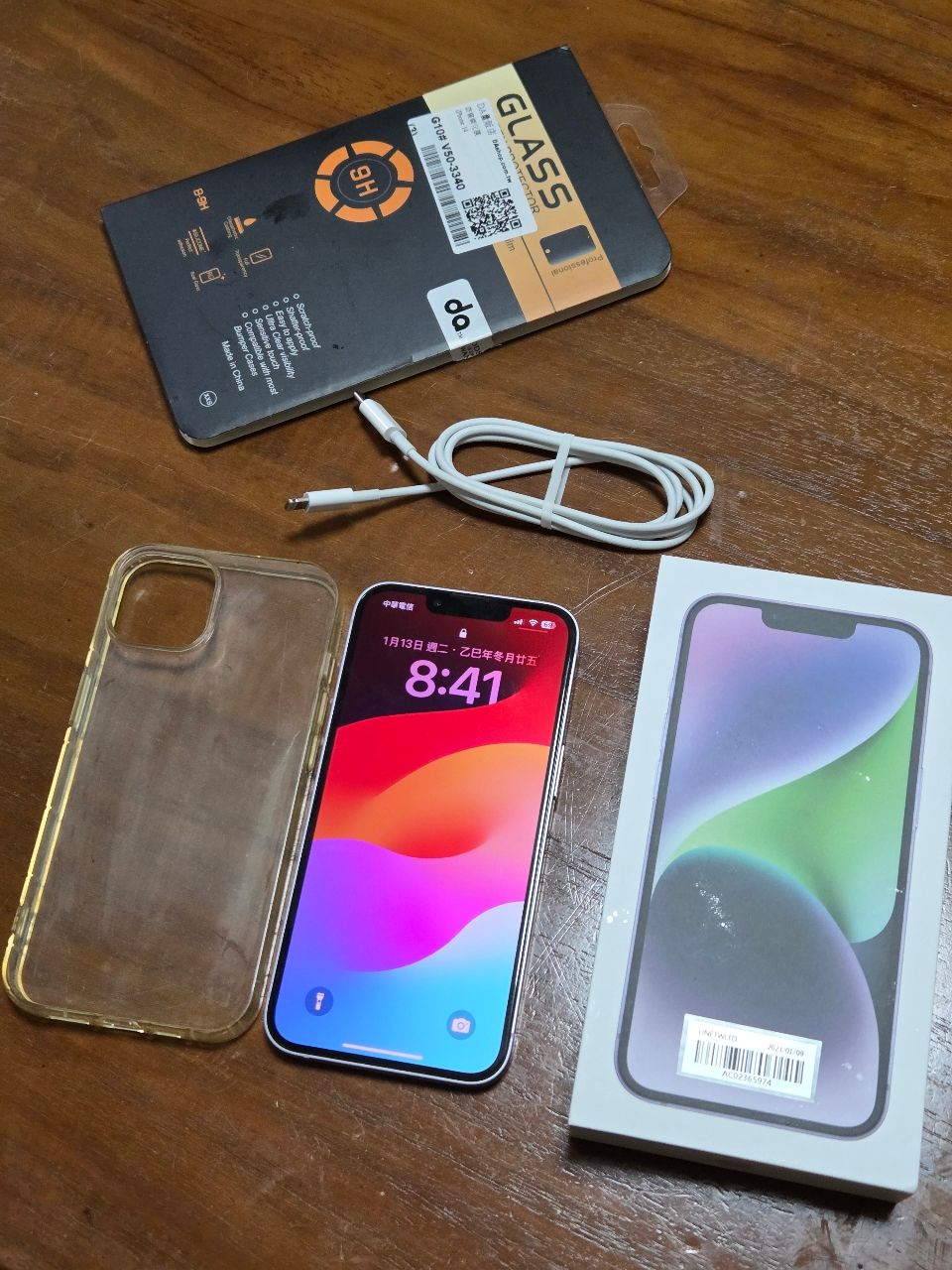盒子跟充電線齊全,買的鋼化膜是兩片一組,還有一片沒使用,也附上便宜的塑膠保護殼