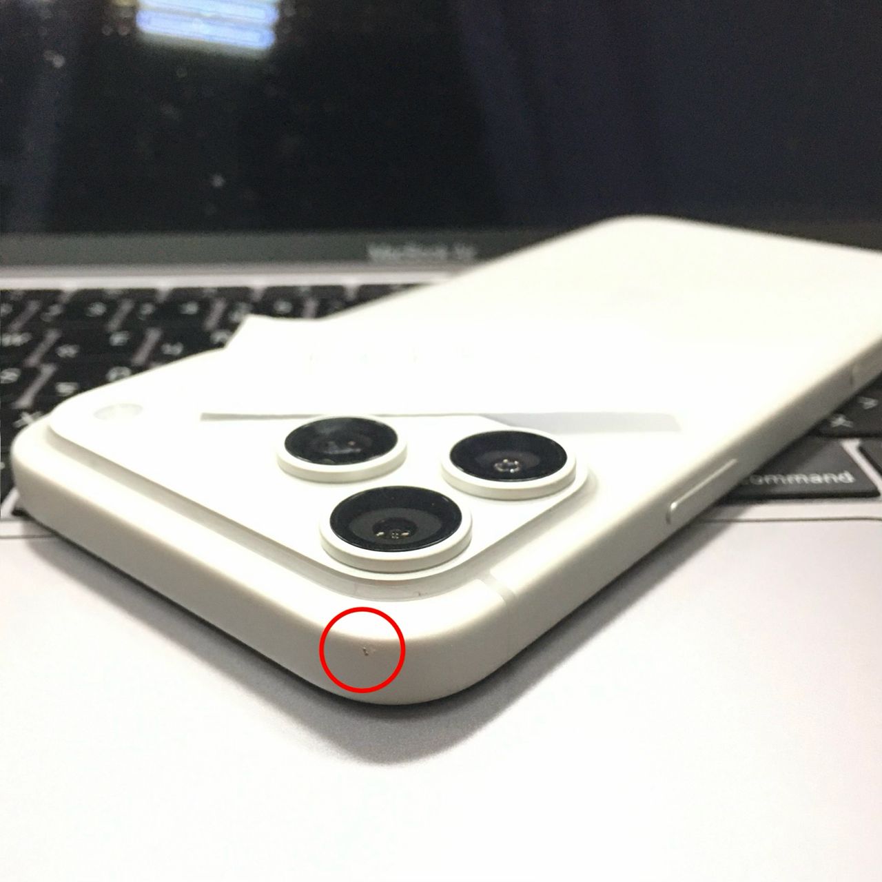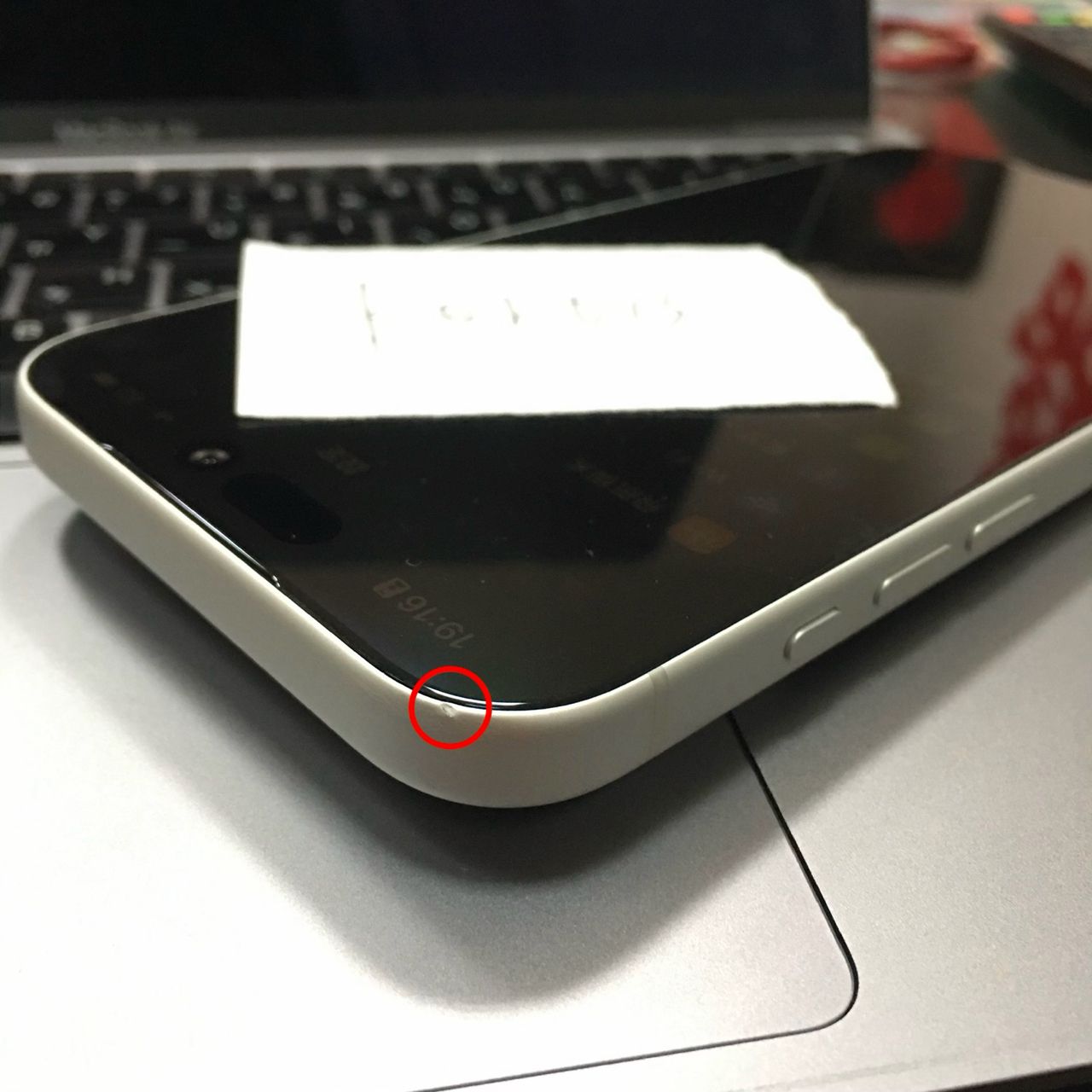 買來就用保護殼,有兩個小凹痕是裝著保護殼敲到的(如紅圈),螢幕完全正常