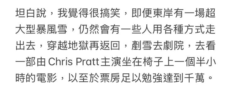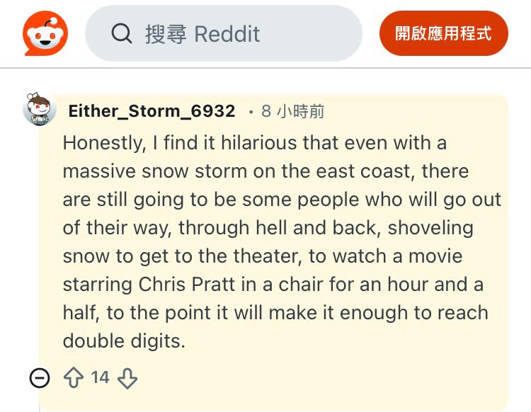 推 razzL1225 : 北美上週其實受暴雪影響,一大堆戲院都暫停營業。所 01/29 03:02