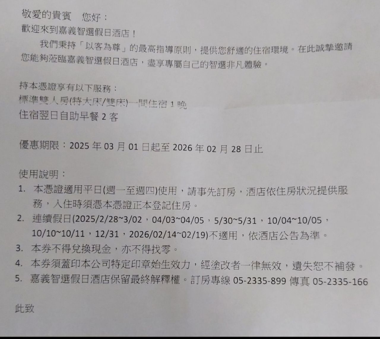 售 嘉義智選假日酒店平日住宿券 2600元, 效期規定如下