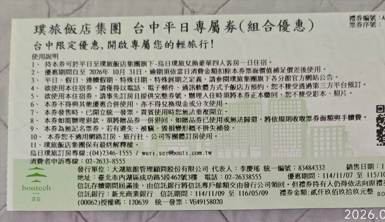 標題[交易] 烏日璞旅平日住宿券