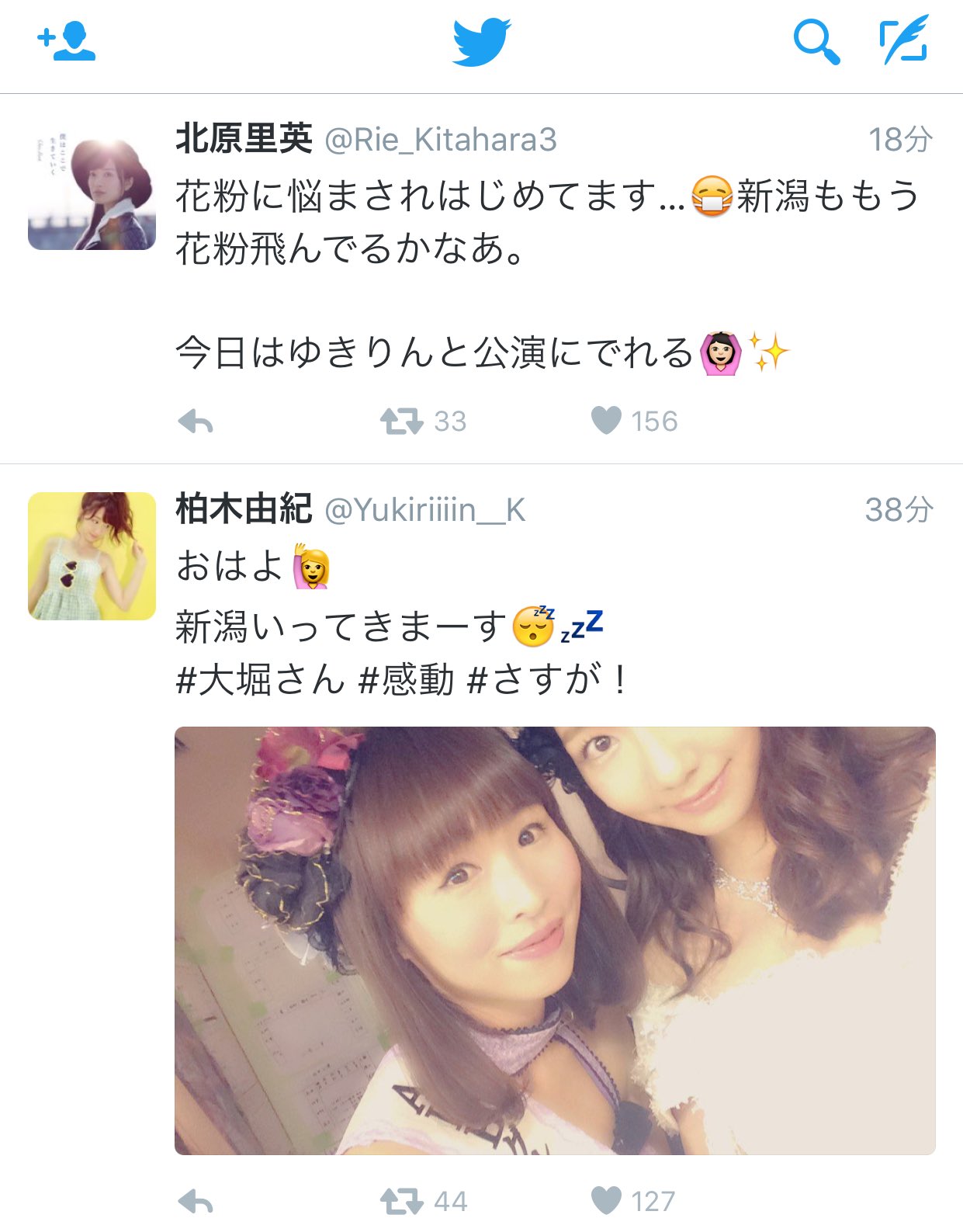 ----------------------------- Twitter & Instagram---------- https://twitter.com/Rie_Kitahara3/status/703701319949758465 阿鰻:要開始為花粉煩惱了...新潟也已經吹起花粉了阿。 今天要跟由紀琳一起上公演 ----------------------------- https://twitter.com/official_NGT48/status/703708769658626048 NGT48:【晴女vs雨女】大家早安。今天的公演上,北原隊長跟柏木前輩都會聚齊。 現在這時候、新潟是放晴的。順帶一提,今天的花粉好像不多喔。 #NGT48 https://pbs.twimg.com/media/CcQTY0TUsAAZcha.jpg:orig#.jpg