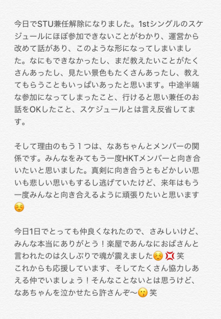 今天我解除了STU的兼任。在了解1單的行程我幾乎都無法參加後,
