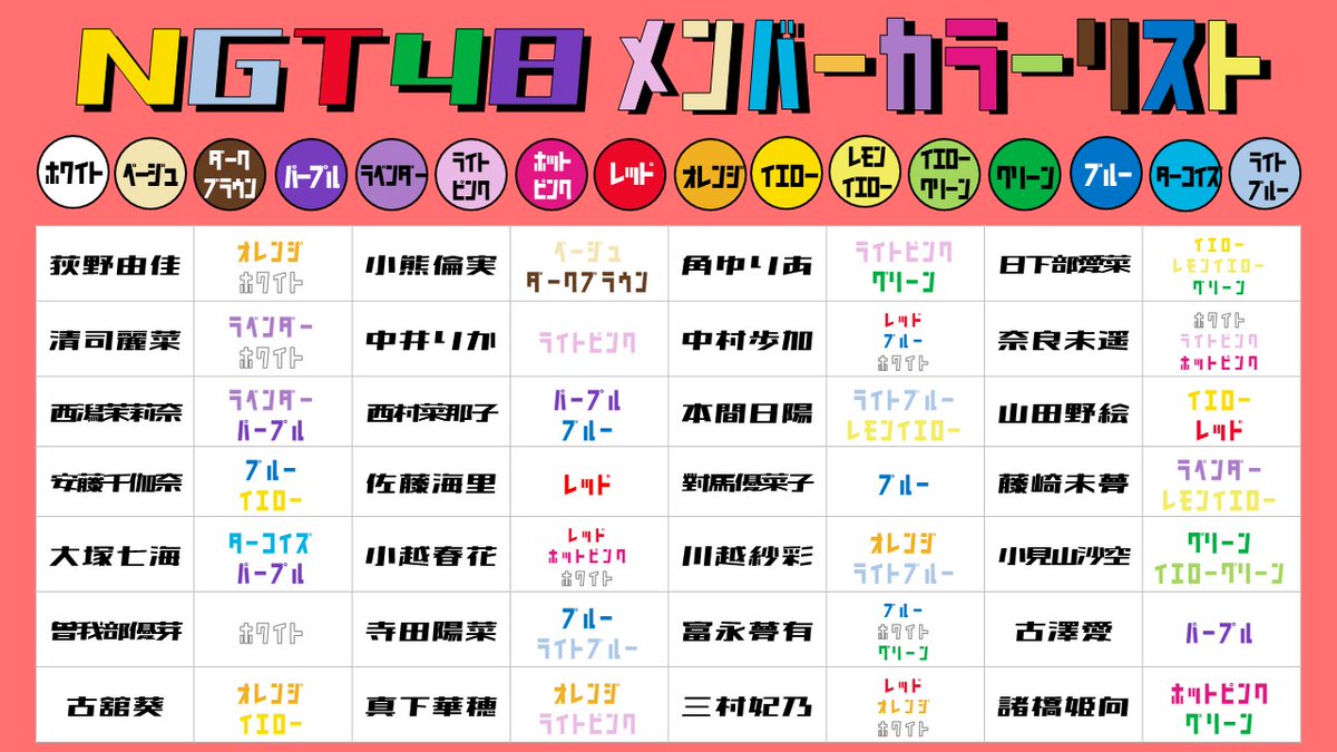 ※個別成員所選擇的顏色請參照表中的照片