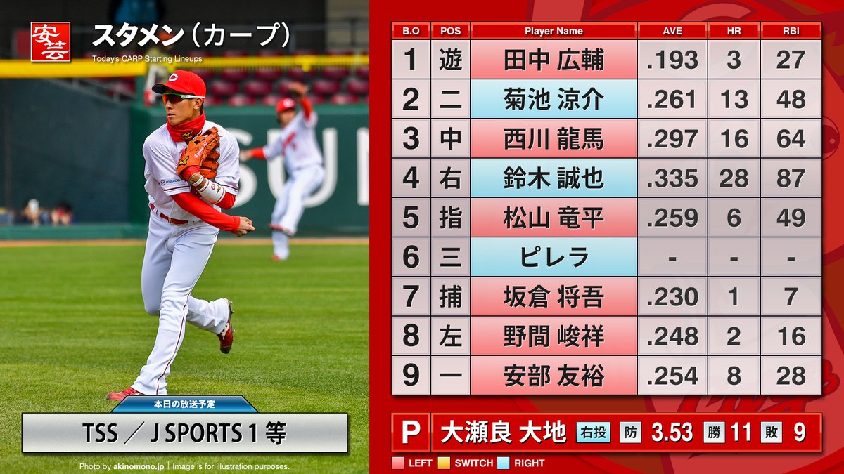 【OP戰】今天的鯉魚隊比賽中場情報・先發球員.得分速報[預