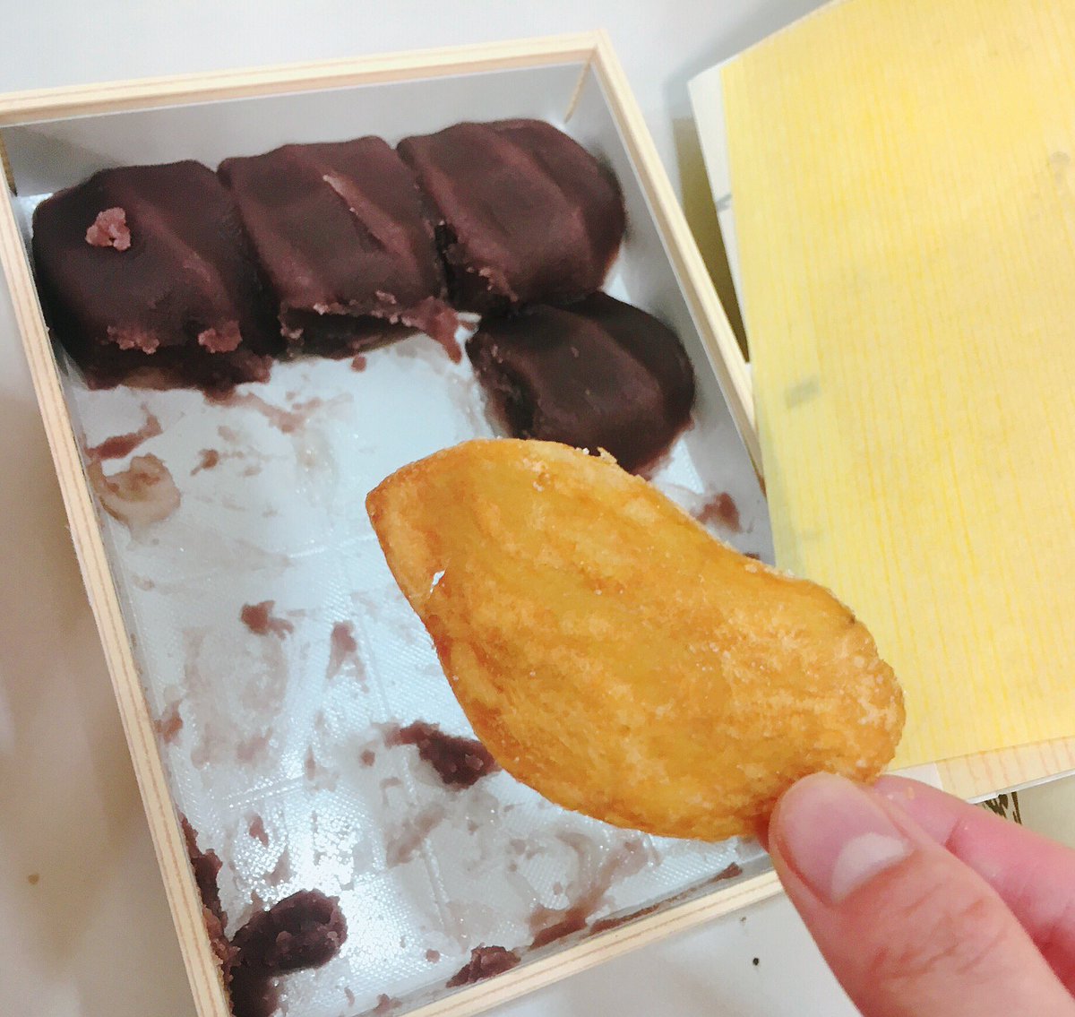 用來拿赤福的湯匙失蹤了,只好用洋芋片來拿,結果比想像中的還更好吃