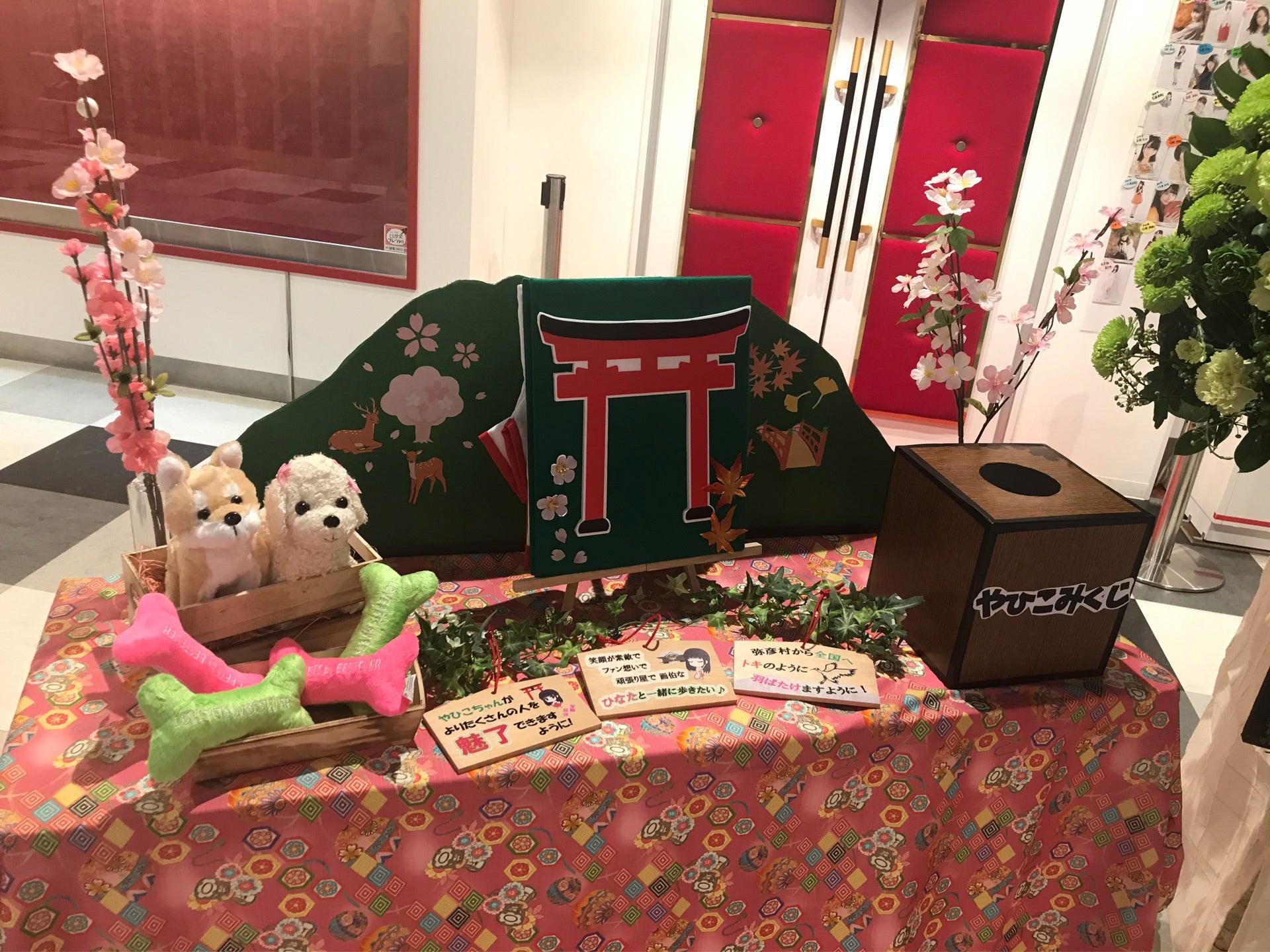 以やひこ觀光景點為主題製作而成的手幅和粉紅色的手環