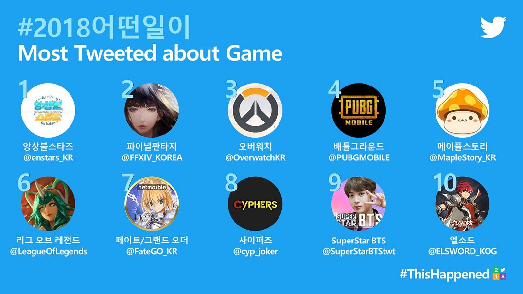 (NO.1 @BTS_twt) 揭曉今年推特上最常被提及的遊戲關鍵字TOP 10 除了從上半年起持續維持在第一的偶像夢幻祭@enstars_KR 之外,恭喜其他遊戲上榜! https://twitter.com/TwitterKorea/status/1070155994984984576 https://pbs.twimg.com/media/Dtn1MFxU8AAuiU-.jpg