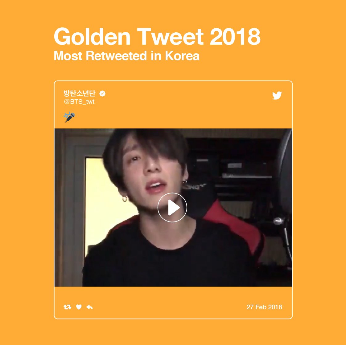 (NO.9 SuperStar BTS) 今年韓國人轉推數最高的2018 Golden Tweet是防彈少年團@BTS_twt 的此則推文。 寫下61萬以上的轉推數紀錄。 #柾國 #JUNGKOOK https://twitter.com/BTS_twt/status/968572393718407168 (180228 柾國清唱all of my life) https://twitter.com/TwitterKorea/status/1070157002523865089 https://pbs.twimg.com/media/Dtn2GunU8AE2CVq.jpg