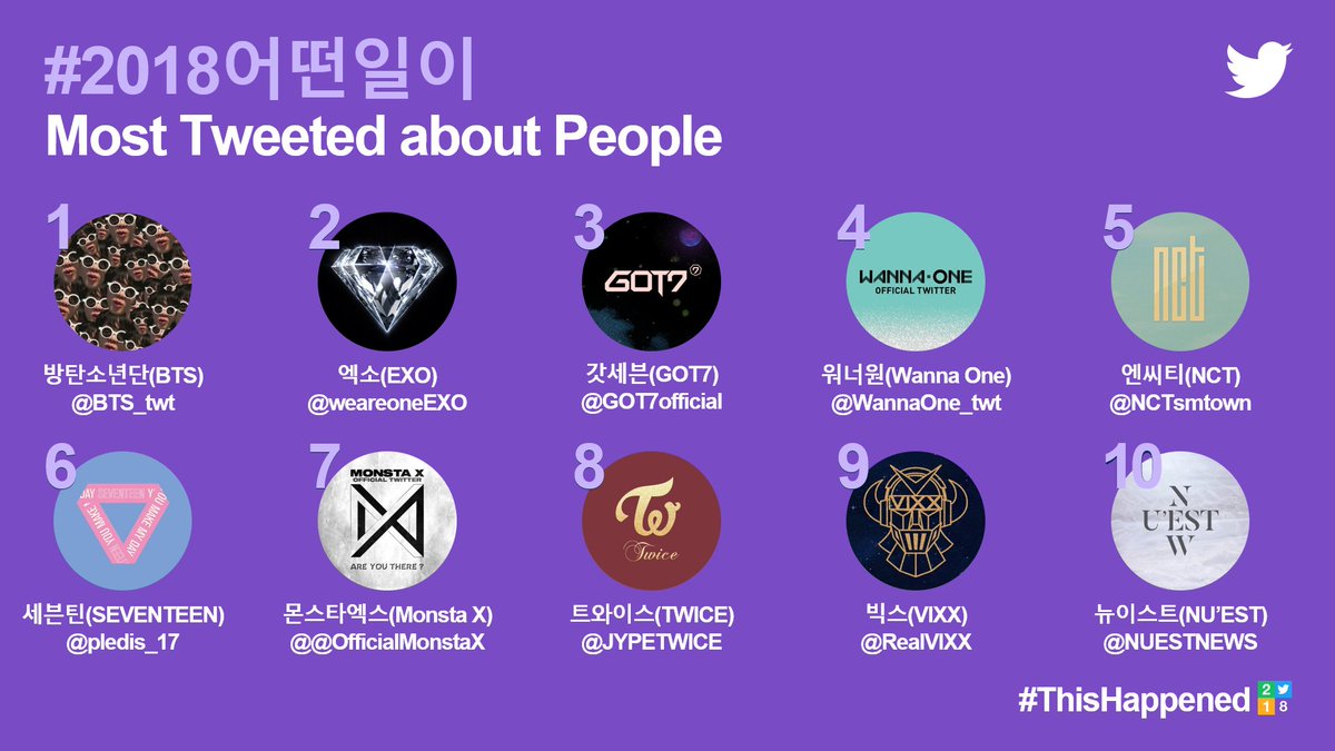billboard The top 10 artists of 2018 #yearinmusic Full chart: https://blbrd.cm/bv6d0x https://twitter.com/billboard/status/1070058913330917376 (#影片) (NO.8 BTS) Twitter Korea 今年韓國中最常在推特上被提及的人物,前10名上榜的都是Kpop藝人們。 @BTS_twt @weareoneEXO @GOT7Official @WannaOne_twt @NCTsmtown @pledis_17 @OfficialMonstaX @JYPETWICE @RealVIXX @NUESTNEWS 恭喜! #2018發生什麼事 #ThisHappened https://twitter.com/TwitterKorea/status/1070152103341912064 https://pbs.twimg.com/media/DtnxqAQU8AE9hdg.jpg