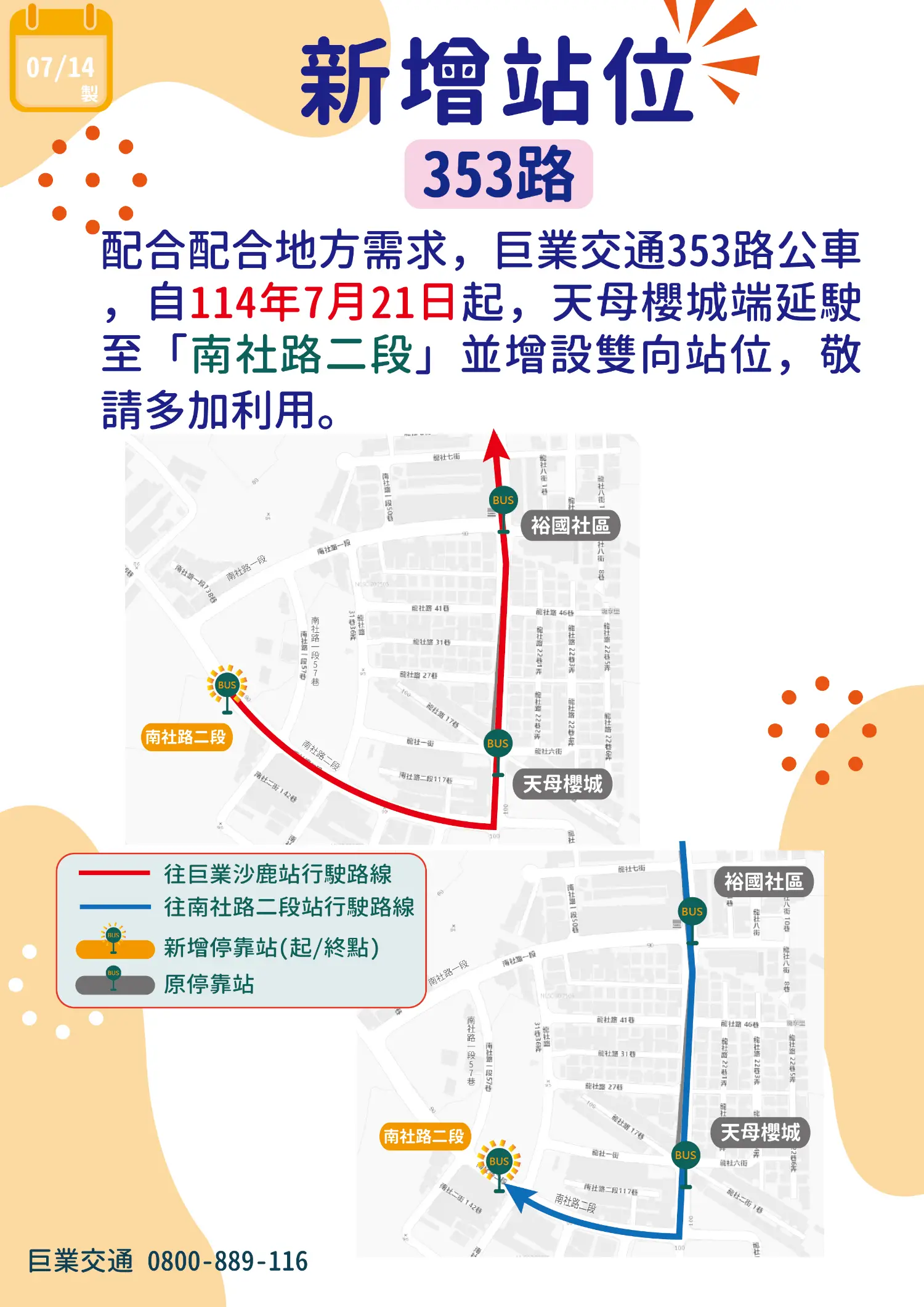 天母櫻城端延駛至南社路二段,新增該站位,路線名稱不變