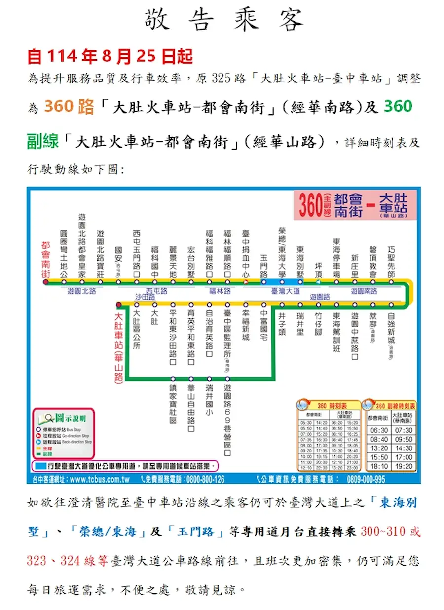 由 臺中車站(民族路口) 調整為 都會南街 發車,併同調整發車時刻表