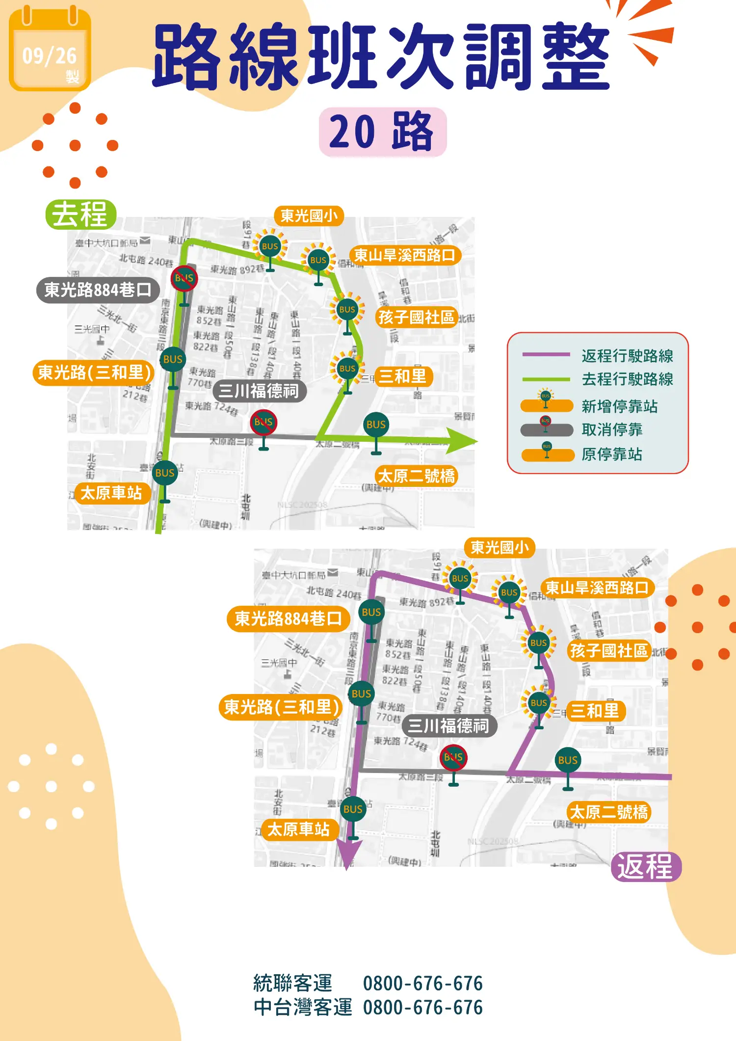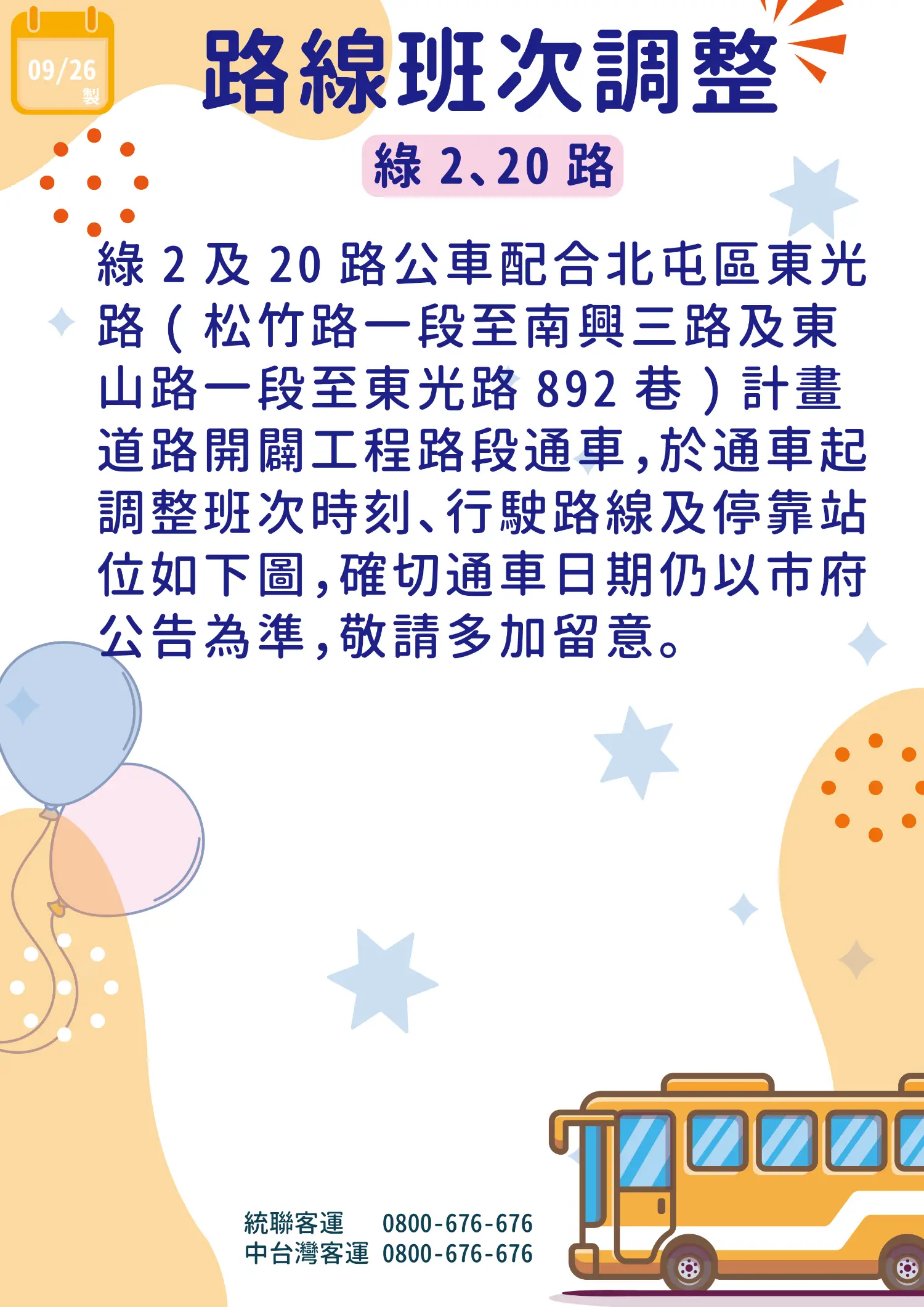 因應東光路計畫道路部分路段完工,調整行駛路線及時刻表